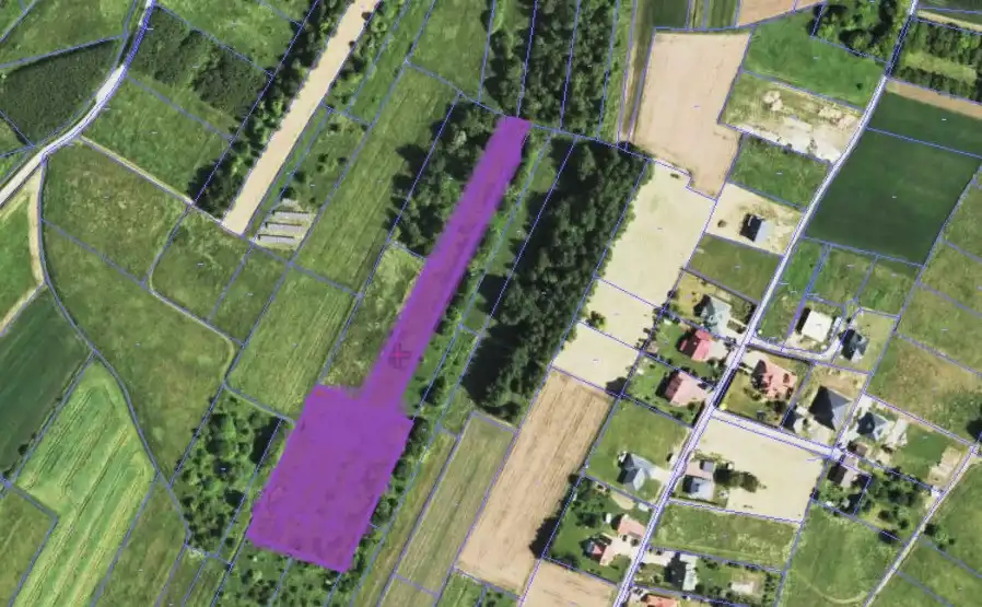 Działka o powierzchni 59a w bezpośrednim otoczeniu domów jednorodzinnych i niskiej zabudowy.