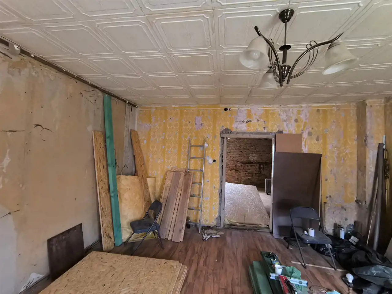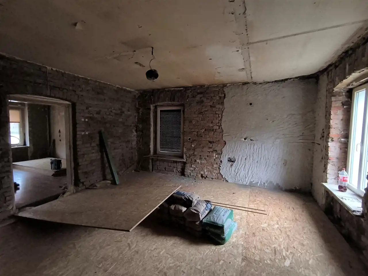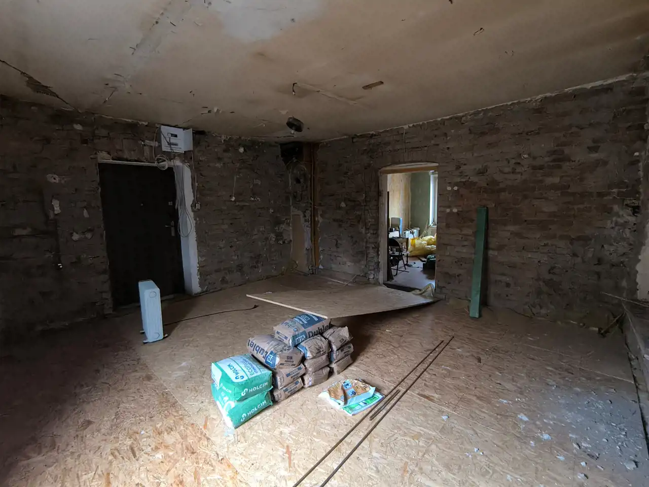 Powierzchnię 47 m2 tworzą (zgodnie z aktem notarialnym - kuchnia i pokój) dwa kwadratowe pomieszczenia z podłączoną instalacją elektryczną oraz kanalizacyjną. W mieszkaniu w większości zostały zbite tynki i zdjęte panele drewniane, w pierwszym pomieszczeniu wykonano nową podłogę (ocieplona i wyłożona płytą osb).