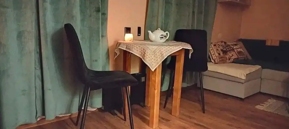 Ogrzewanie: piecyk typu koza plus energooszczędny grzejnik elektryczny z regulacją mocy.