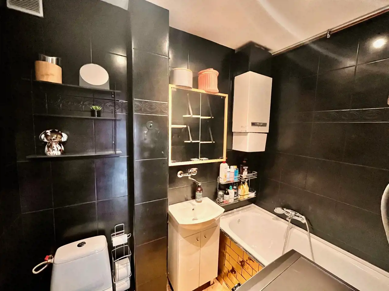 Standard wykończenia: stolarka okienna PCV, na ścianach gładzie i tapety na podłogach panele podłogowe. Łazienka wykończona glazurą i terakotą w czarnej tonacji wyposażona w wannę i umywalkę.