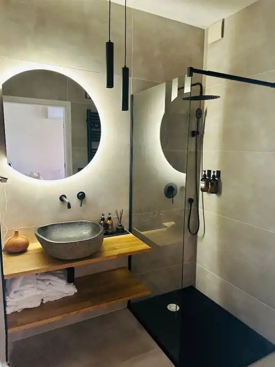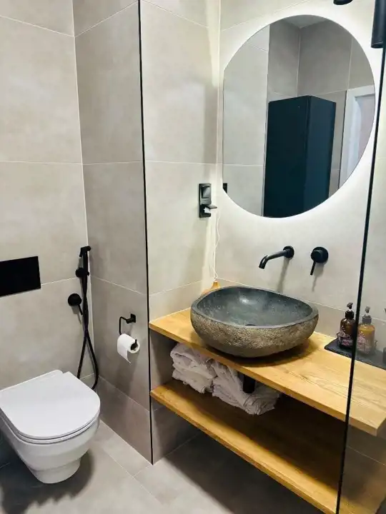 Kuchnia również została wykonana pod wymiar na zamówienie, wykończona blatem dębowym. Salon oraz sypialnia jest podświetlana ledowym światłem tworząc nastrojową atmosferę wieczorem. W salonie znajduje się biokominek który jest nie tylko ładna ozdoba ale również podgrzewa temperaturę o ok 3/4 stopnie.