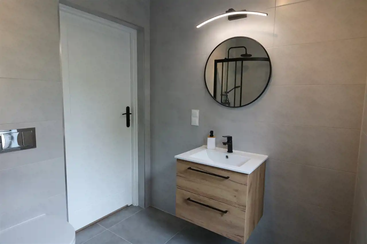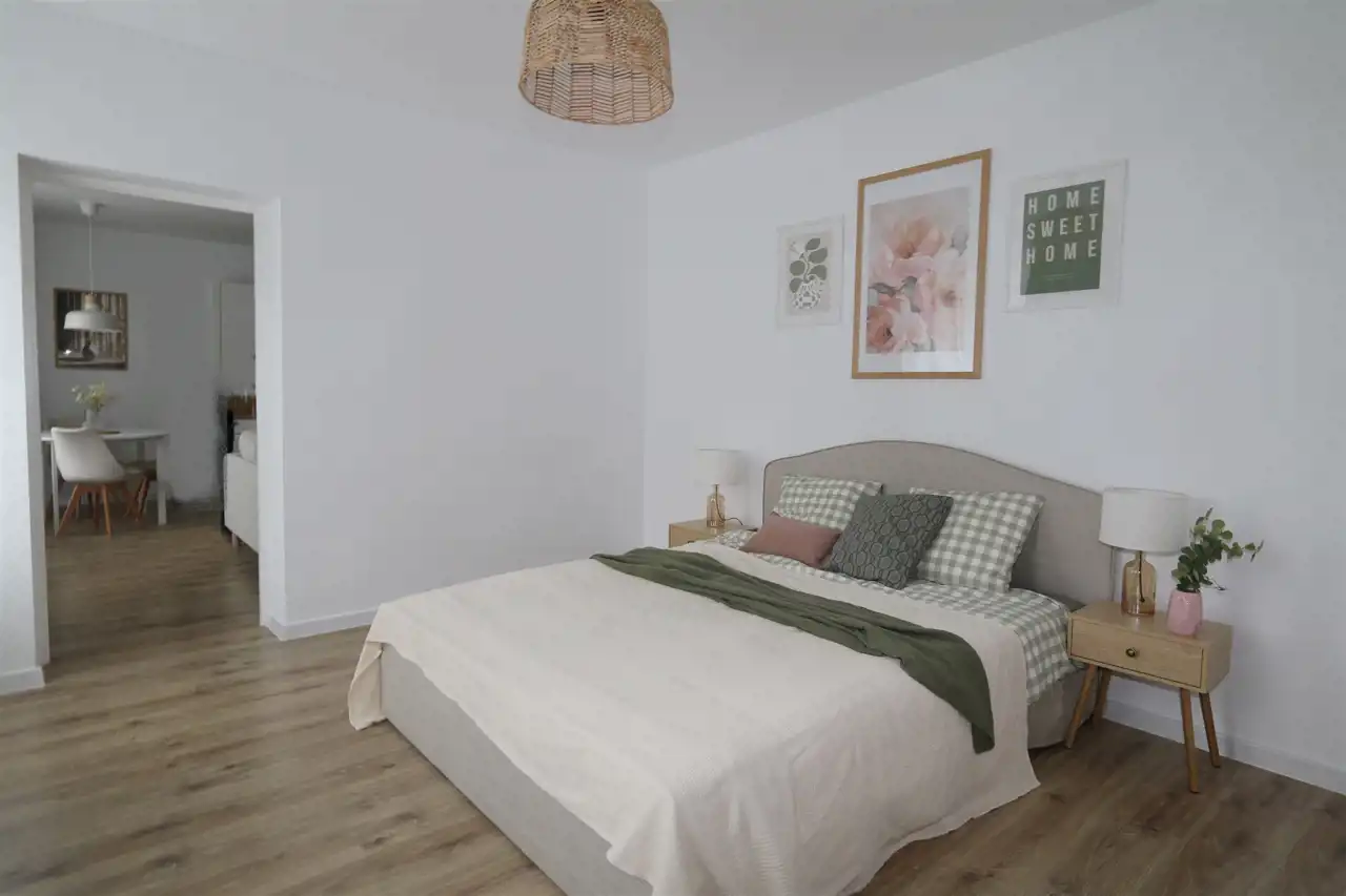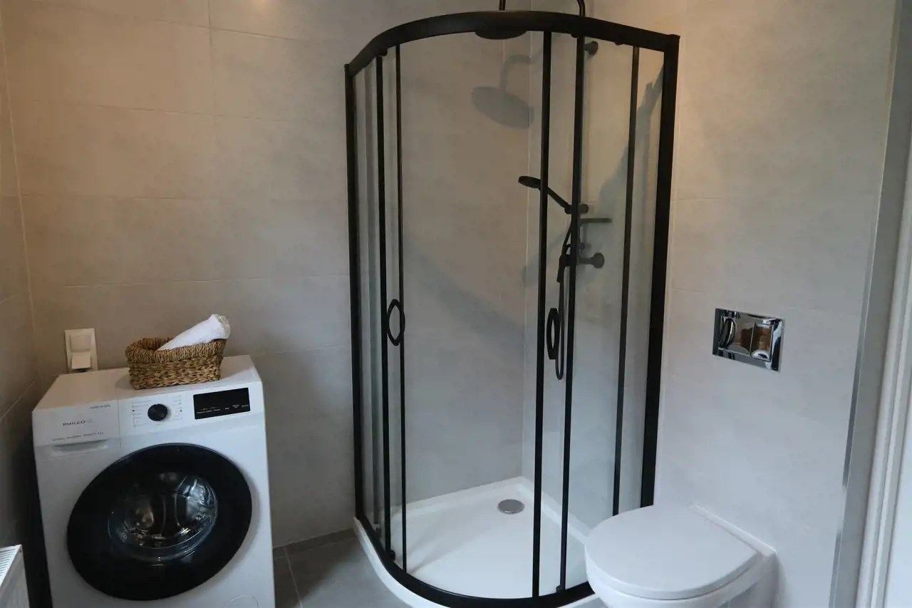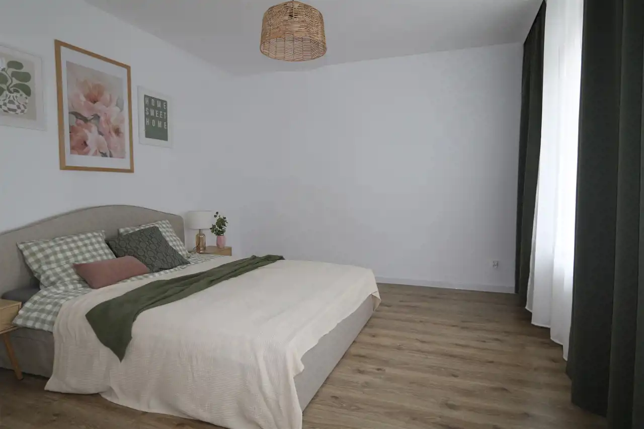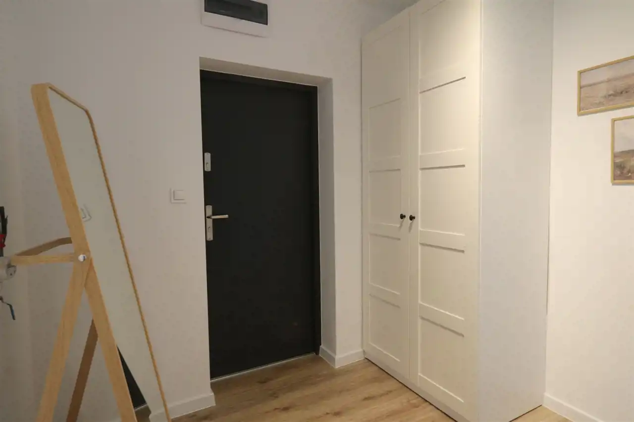 Układ: jasny salon z aneksem, duża sypialnia, duża łazienka z prysznicem, przedpokój