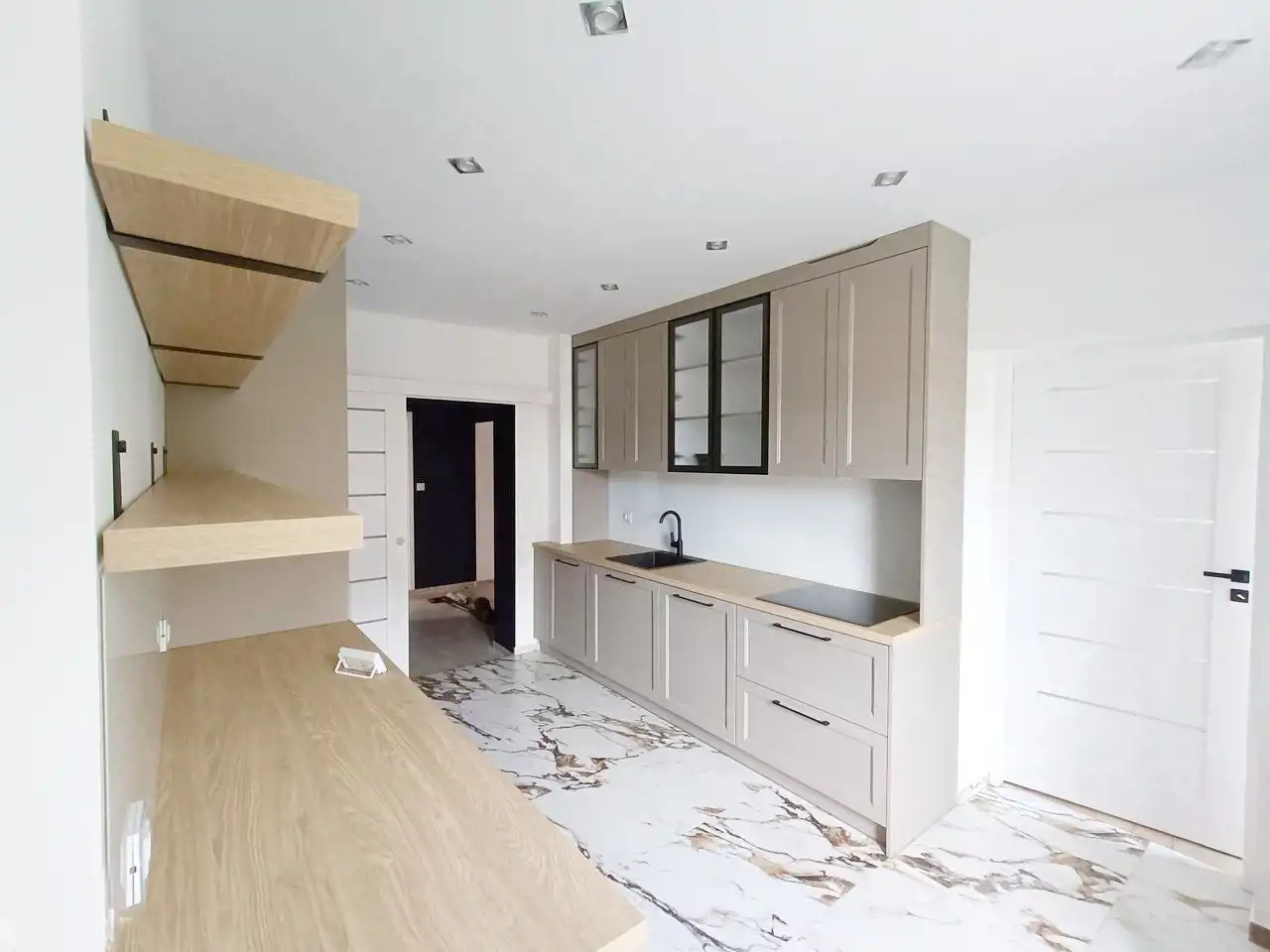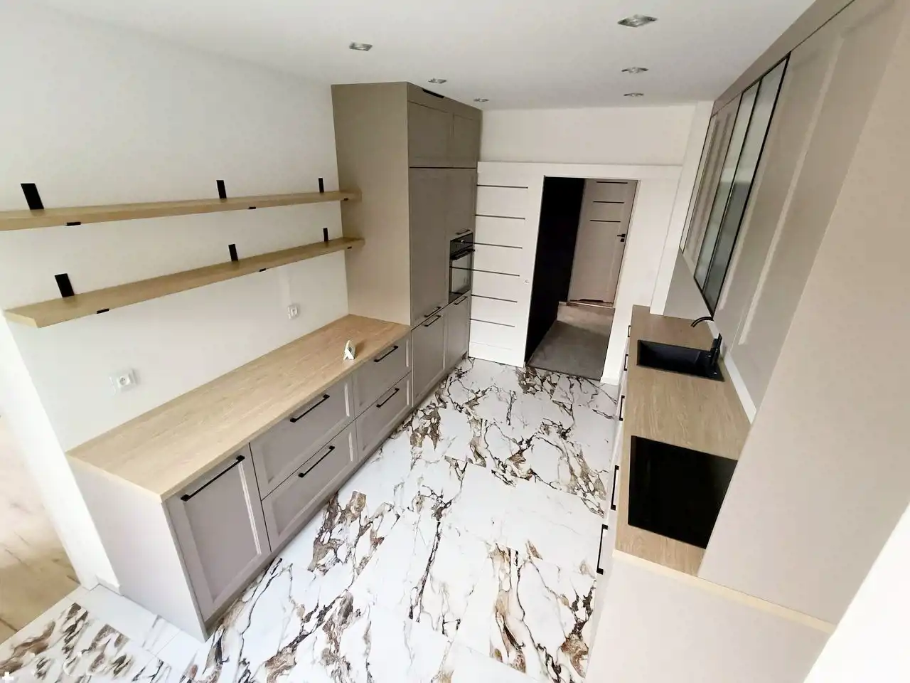 - Nowoczesna kuchnia w zabudowie po obu stronach z pełnym AGD (lodówka, zmywarka, piekarnik, płyta indukcyjna, pralka – wszystko w zabudowie)