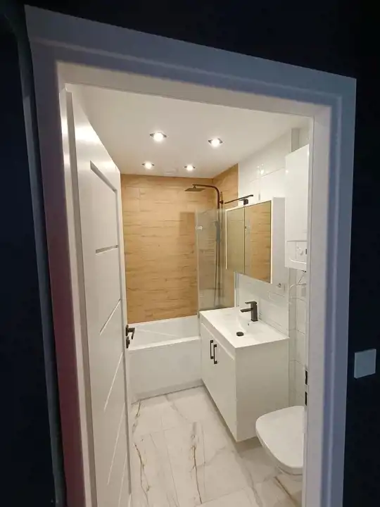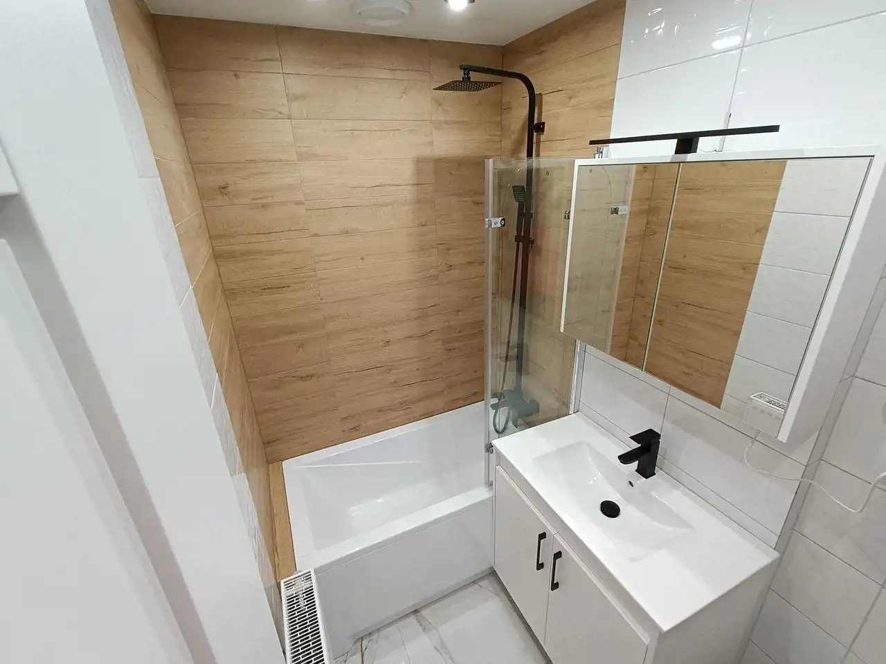 - Łazienka z wanną, szafką pod umywalką i lustrem z zabudową