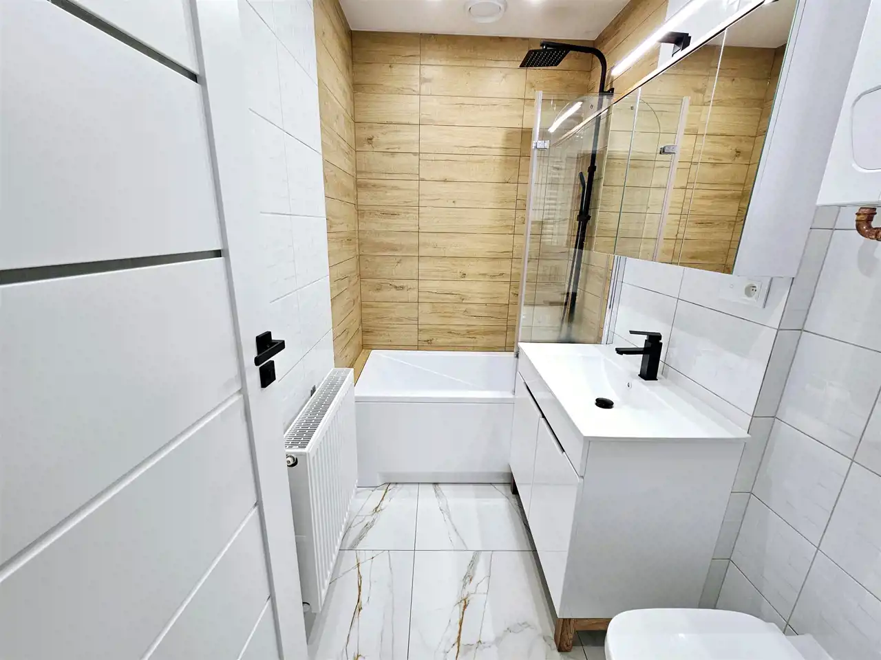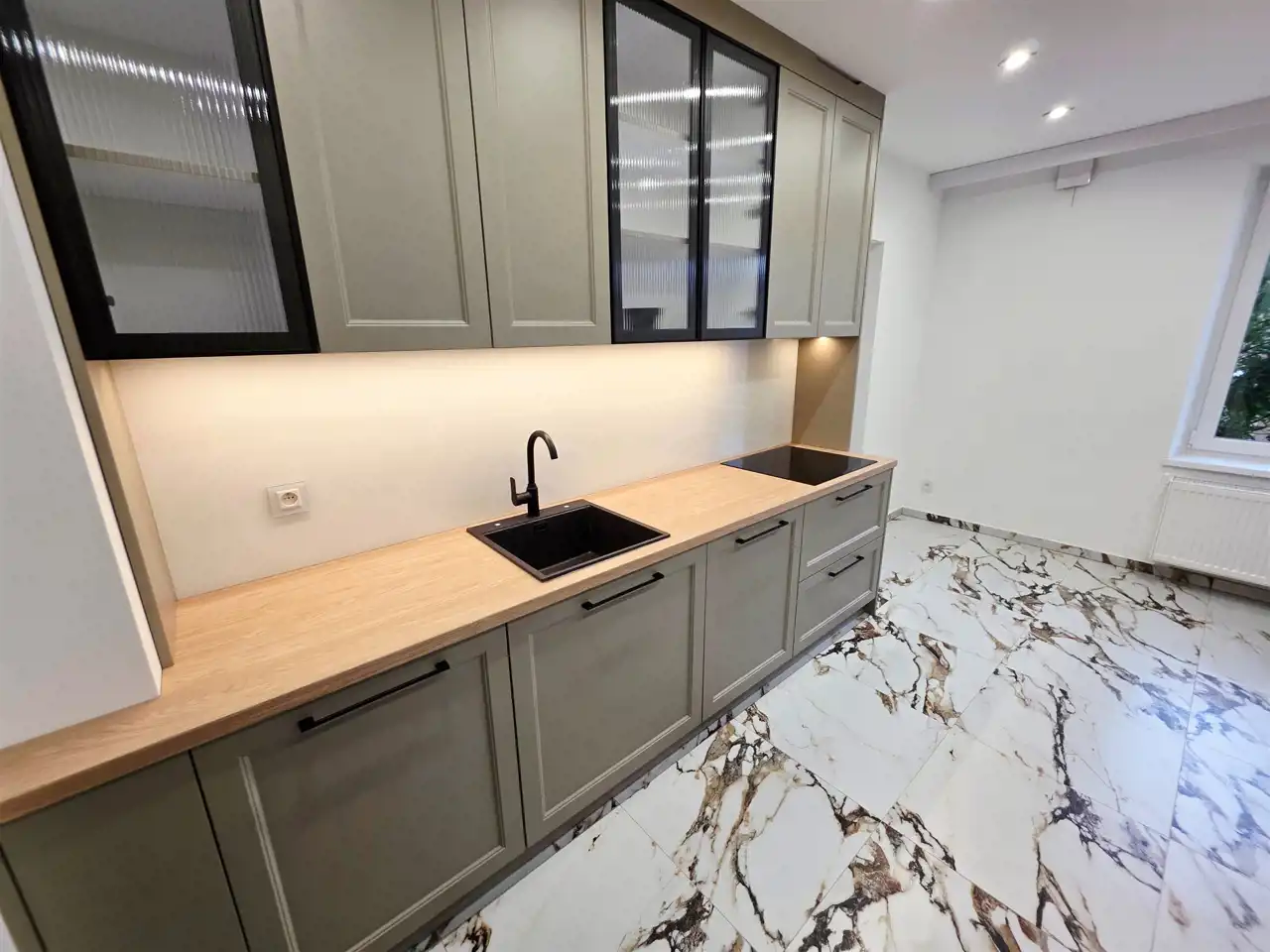 Mieszkanie o bardzo dogodnym układzie pomieszczeń, ustawne, dwustronne, stanowiące odrębną własność z wykupionym gruntem. W cenie meble kuchenne ze sprzętem AGD (pralka, lodówka, zmywarka, płyta indukcyjna, piekarnik, pochłaniacz) oraz szafy w zabudowie.
