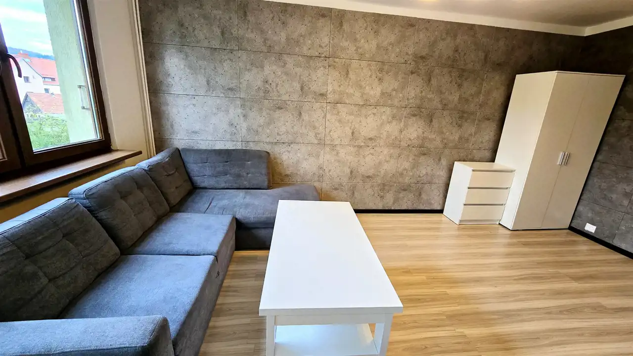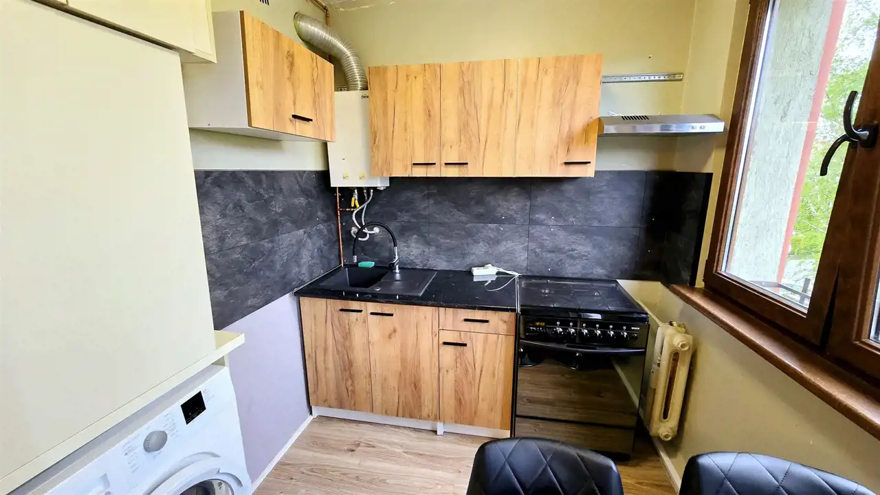 Na wyposażeniu kanapa z funkcją spania, szafa, stolik, meble kuchenne, pralka, lodówka i kuchenka.