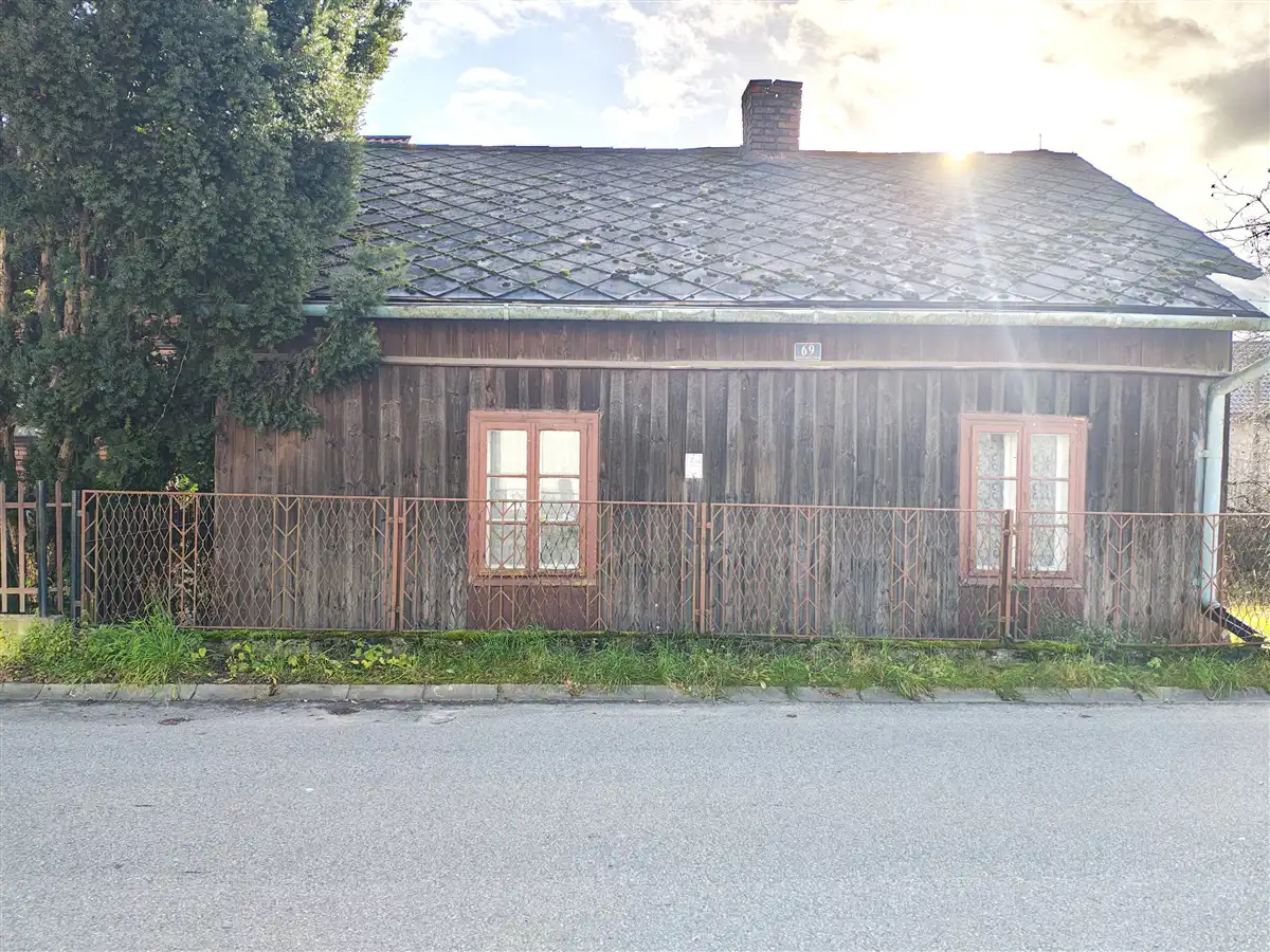 Do sprzedaży parterowy dom wolnostojący, wykonany z drewna, o powierzchni użytkowej około 78 m2. Dach pokryty jest eternitem. Okna starego typu drewniane.