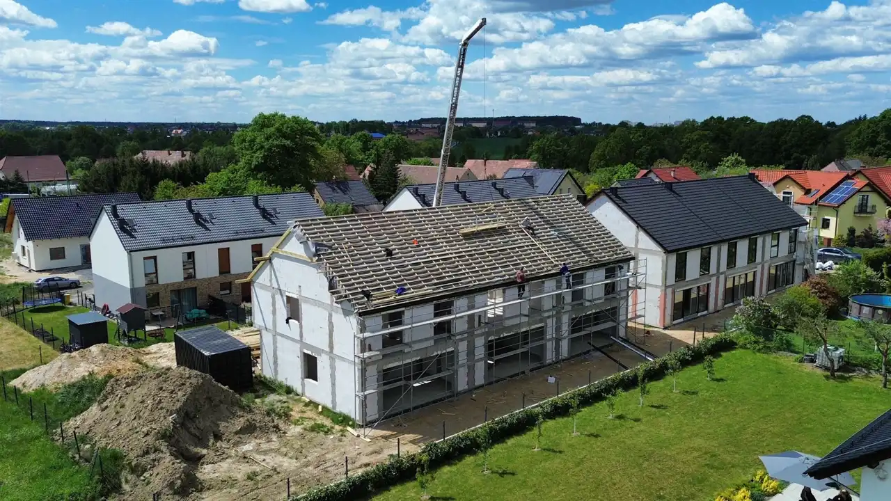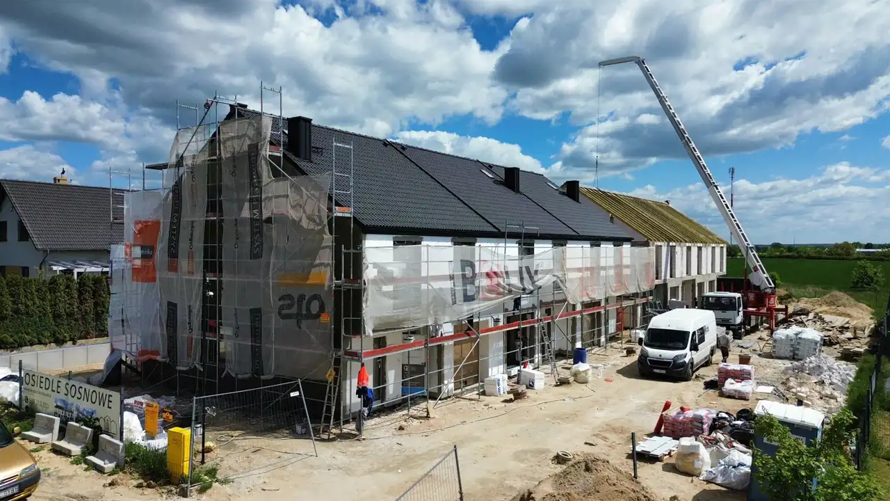 - Używamy sprawdzonych i solidnych materiałów. Budynki są wykonane z wytrzymałego gazobetonu, docieplone styropianem oraz pokryte dachówką betonową.