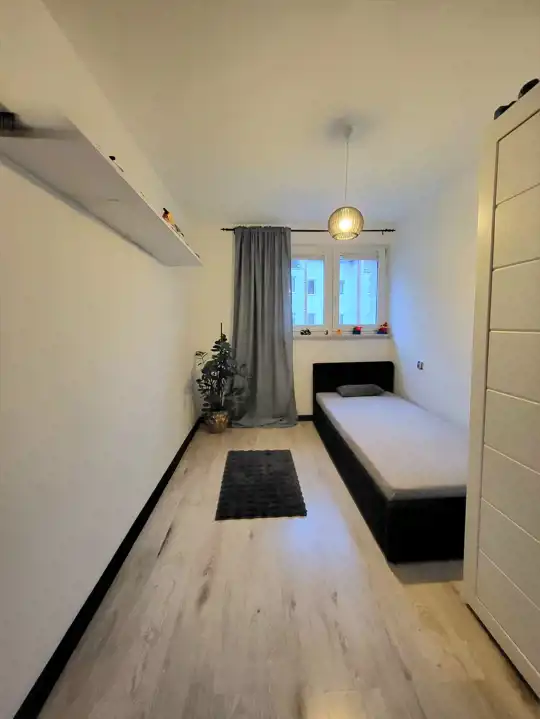 sypialni z dużym oknem i miejscem na pojemną szafę,