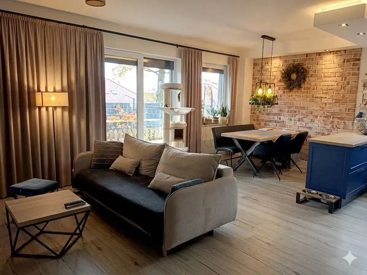 * Pokój dzienny z aneksem kuchennym (34,0 m²): Serce domu. Przestronny salon z jadalnią i stylową, w pełni wyposażoną kuchnią. Duże, przesuwne drzwi prowadzą bezpośrednio do ogrodu.