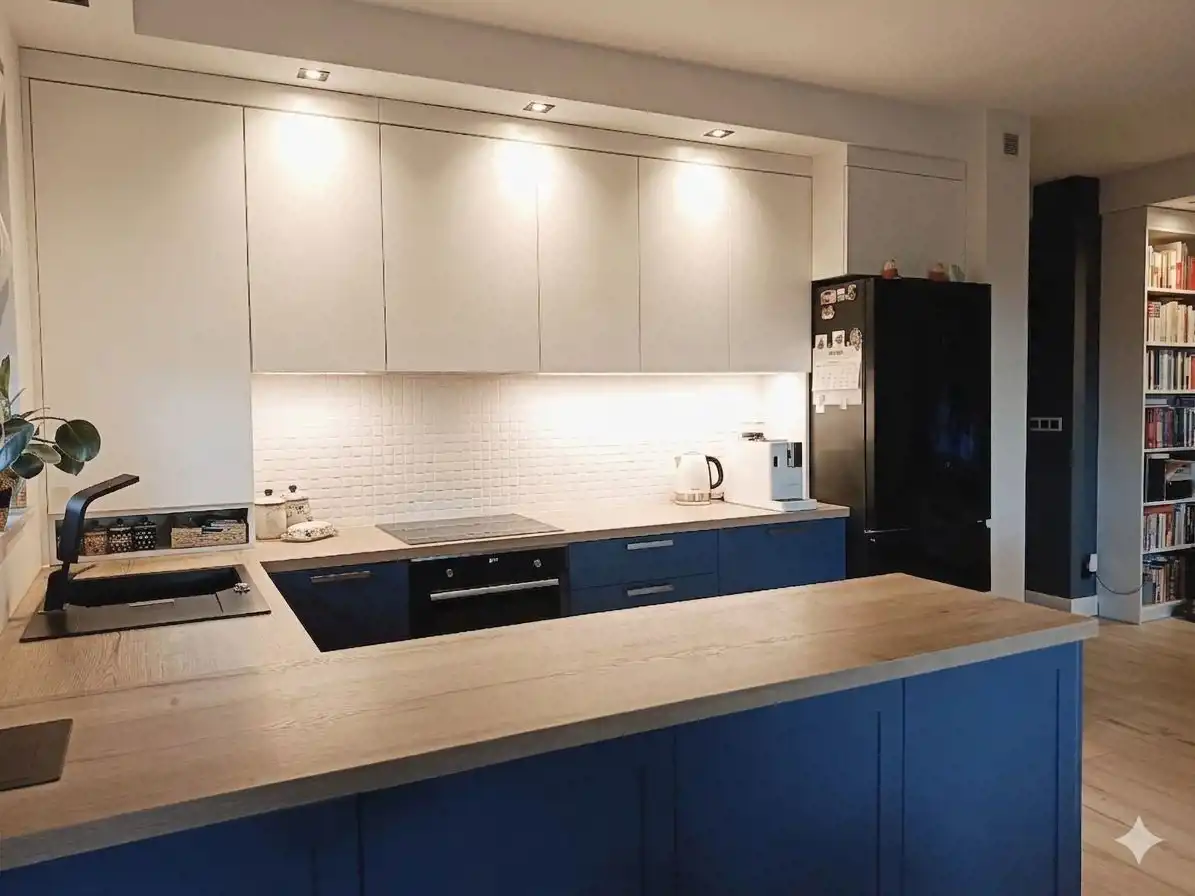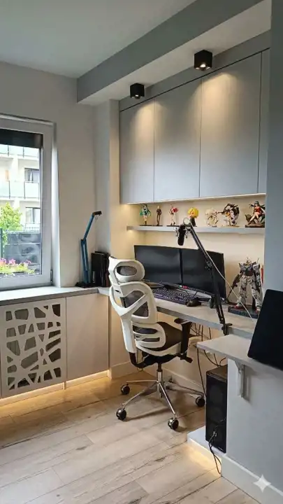 Dzięki zabudowom stolarskim wykonanym na wymiar przestrzeń została doskonale zagospodarowana, oferując mnóstwo miejsca do przechowywania przy zachowaniu pełnej estetyki wnętrza. Dodatkowym atutem są zewnętrzne rolety we wszystkich oknach, które zapewniają prywatność, bezpieczeństwo oraz doskonałą izolację termiczną.