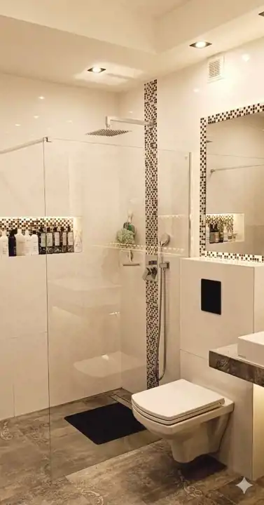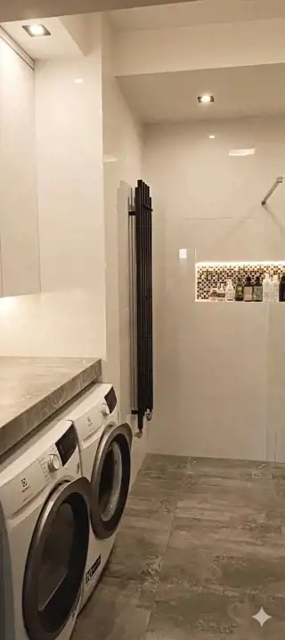* Łazienka (5,9 m²): Elegancka, z dużym prysznicem typu walk-in oraz zabudowaną pralką i suszarką.