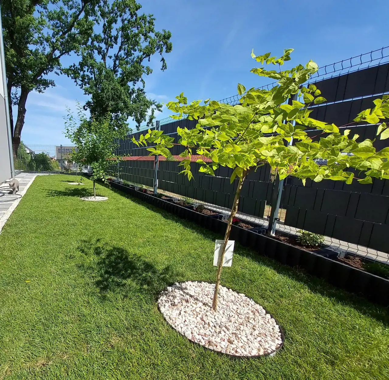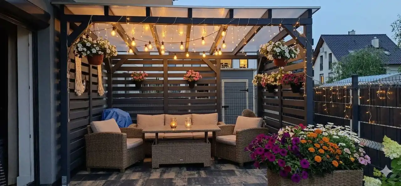 Ogród zachwyca klimatem i starannie zaplanowaną roślinnością – liczne nasadzenia, drzewa oraz krzewy tworzą intymną oazę sprzyjającą relaksowi. Całość dopełnia zabudowana pergola, dzięki której można korzystać z ogrodu niezależnie od pogody. To idealne miejsce na odpoczynek, spotkania z bliskimi czy letnie kolacje na świeżym powietrzu.