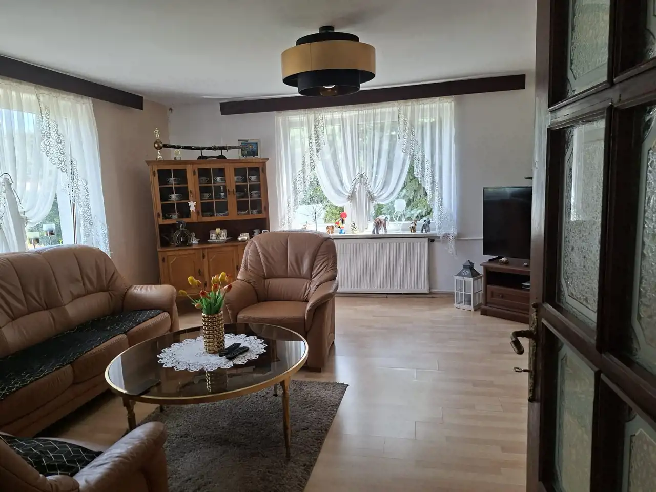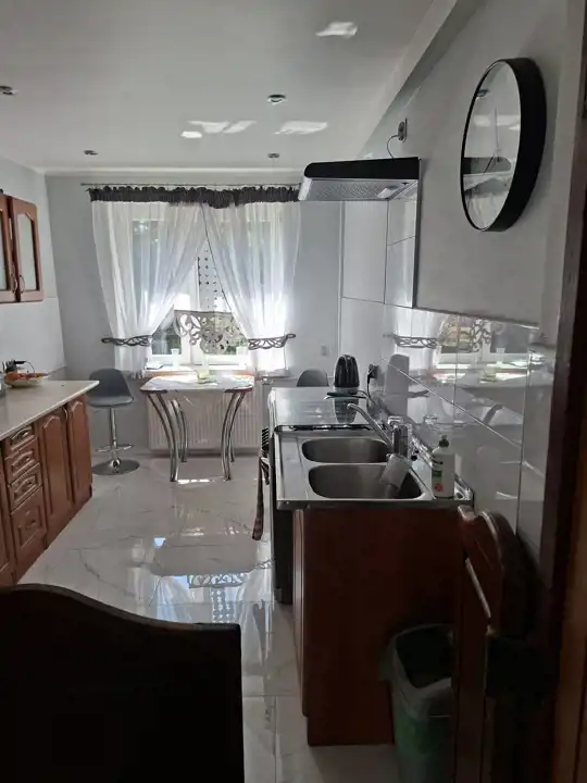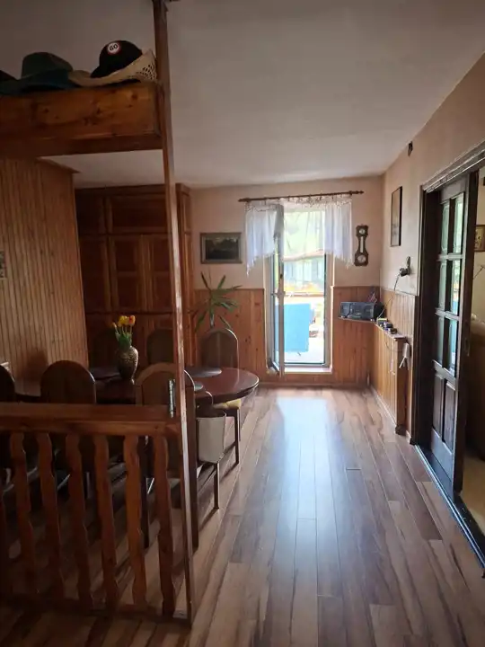 Na piętrze pokoje wykończone panelami, ściany gładzone, okna PCV. Kuchnia umeblowana i wyposażona, wykończona płytkami gresowymi oraz glazurą. Łazienka razem z wc, wykończona glazurą.