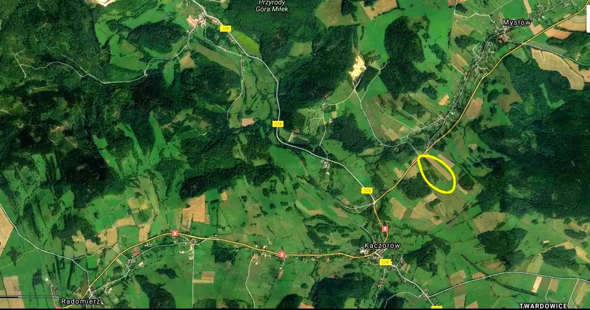 Malowniczo położona nieruchomość gruntowa o pow. niemal 5 ha w Sudetach Zachodnich (Góry Kaczawskie) w Mysłowie, gmina Bolków, powiat jaworski. Działka w przeważającej części zajęta przez łąki i w znacznie mniejszej części zadrzewiona. Działka lekko pochylona w kierunki południowo - wschodnim. Do działki jest doskonały dojazd, bezpośredni zjazd z drogi międzynarodowej E-65 na trasie z północy Polski i Wrocławia do granicy państwa z Czechami. W planach jest poszerzenie drogi, która będzie stanowić część trasy szybkiego ruchu S3. W okolicy liczne atrakcje turystyczne: rezerwaty przyrody Góra Miłek i Buki Sudeckie. Dla działki prowadzona jest księga wieczysta bez obciążeń w III i IV dziale.