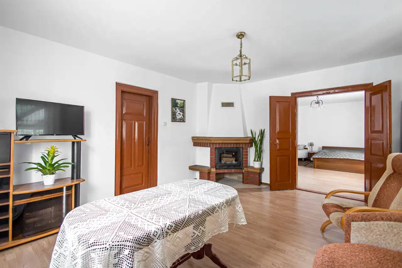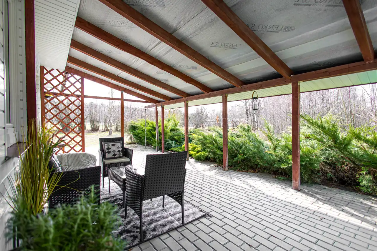 Stan techniczny domu: Dom gotowy do zamieszkania. Budynek w konstrukcji drewniano-murowanej, wybudowany w latach 2002-2003. Ściany z bali sosnowych docieplone wełną mineralną oraz część murowana z pustaków z gazobetonu docieplona styropianem. Ściany od zewnątrz obłożone sidingiem oraz płytą kartonowo-gipsową od wewnątrz. Strop drewniany. Okna pcv. Budynek kryty blachodachówką. Ogrzewanie gazowe, kominek.