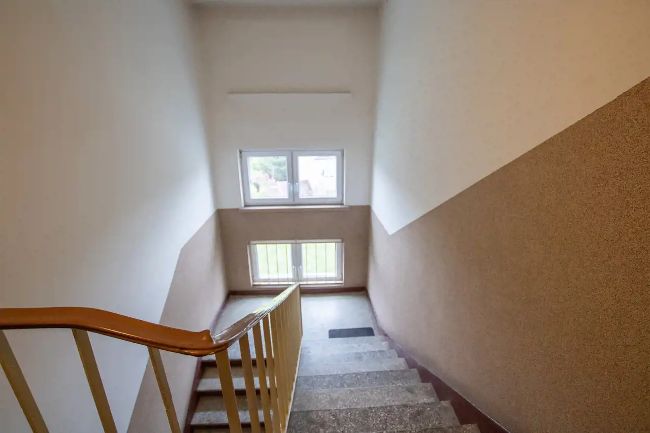 Klatka schodowa jest czysta i zadbana za co odpowiada spółdzielnia mieszkaniowa "Zatoka".