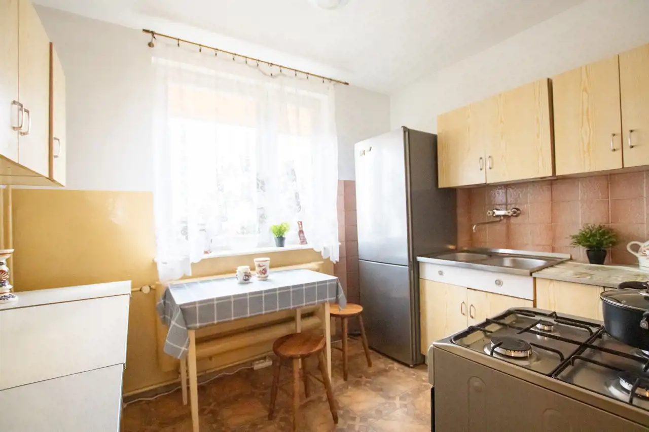 -Kuchnia : kuchnia na butlę gazową, lodówka, meble kuchenne, zlewozmywak, stół