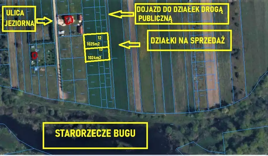 Oferujemy tu kilka działek o powierzchni 1000m2, 1024m2 położonych przy starorzeczu Bugu w odległość od około 20m do 350m w zależności od działki.