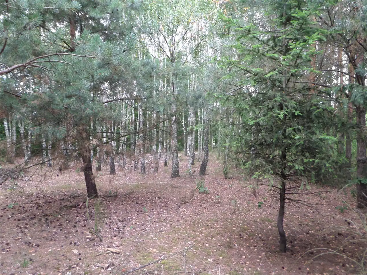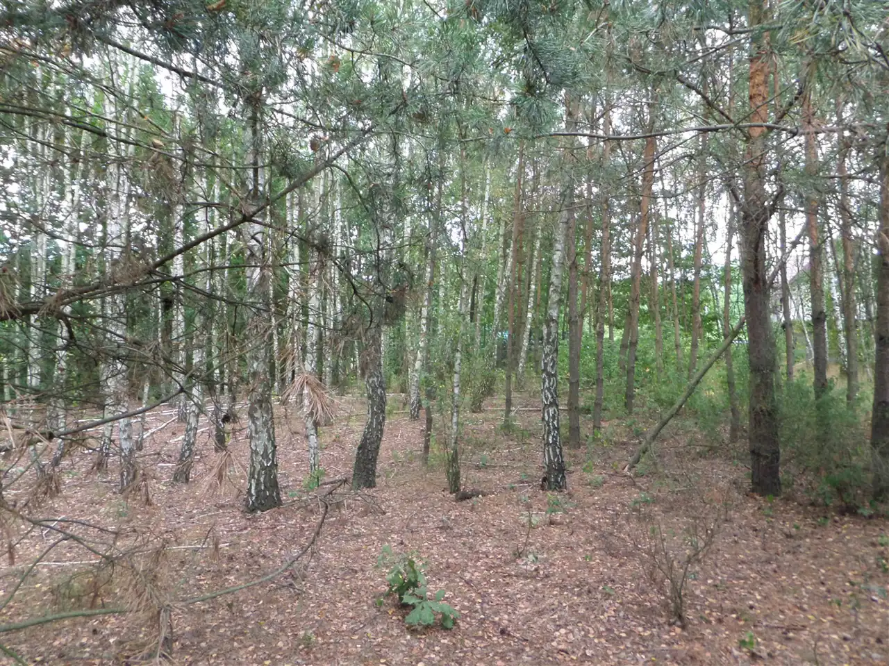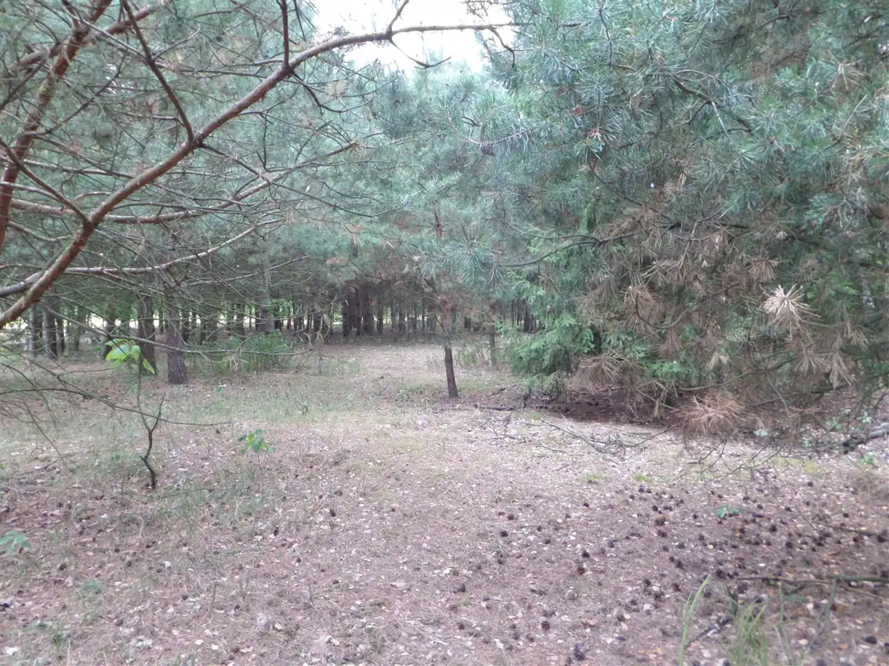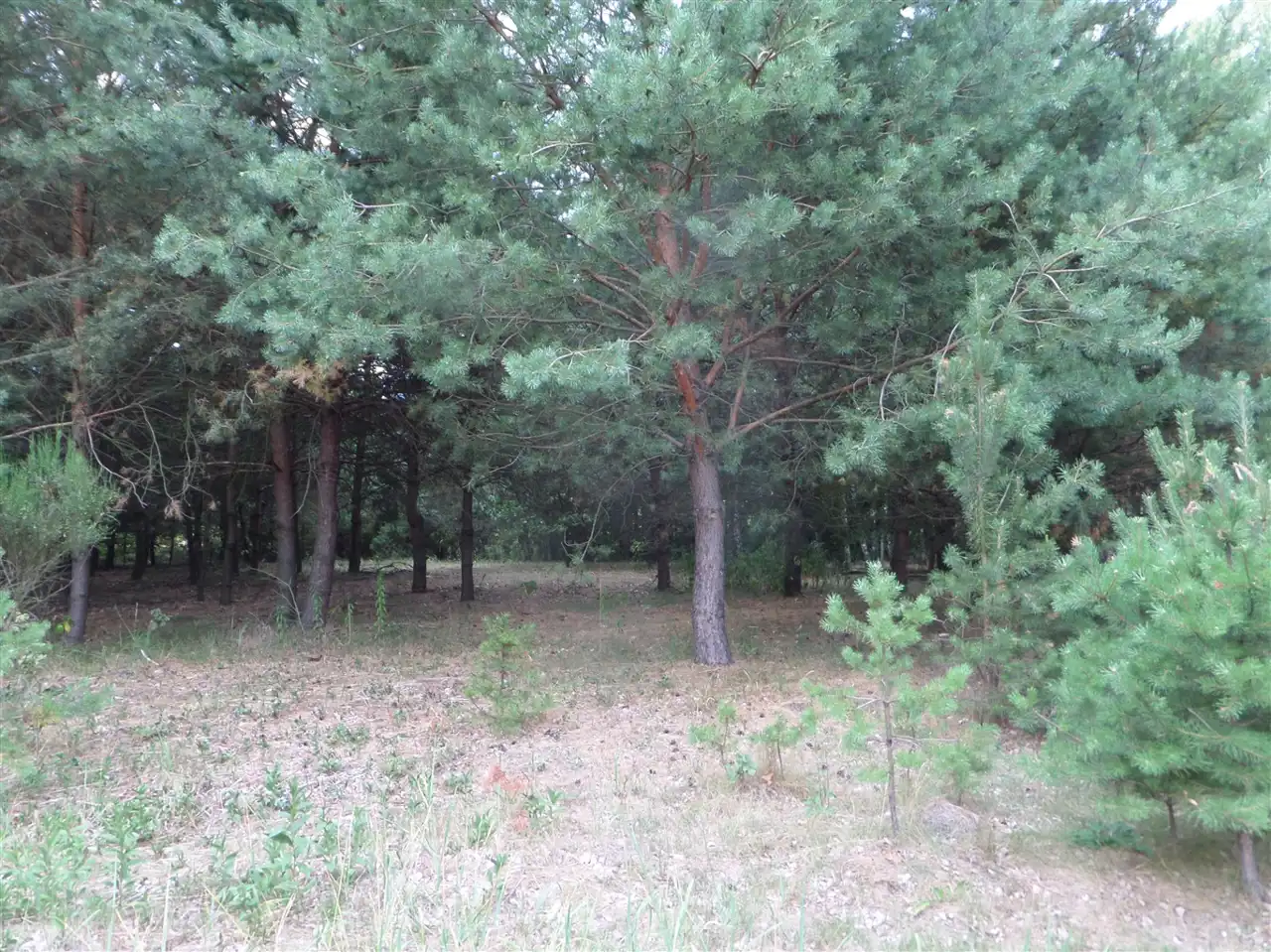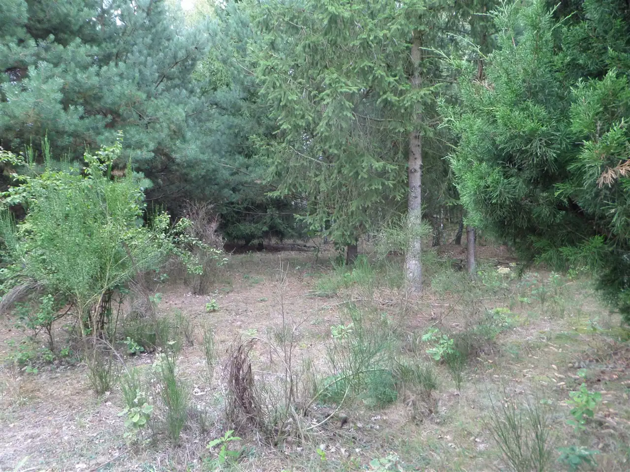 Działka jest w sporej części zalesiona, samosiejkami, ale ma już przygotowane miejsca, gdzie można postawić dom.