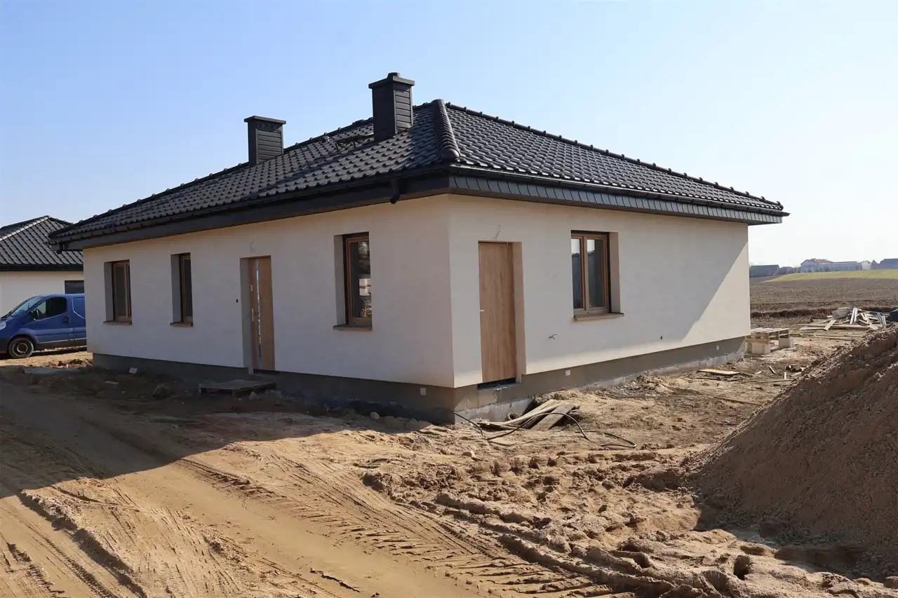 Zdjęcia przedstawiają budynek według tego samego projektu wybudowany w innej lokalizacji oraz aktualne zaawansowanie budowy. Istnieje możliwość dostosowania domu do własnych potrzeb nowego właściciela.