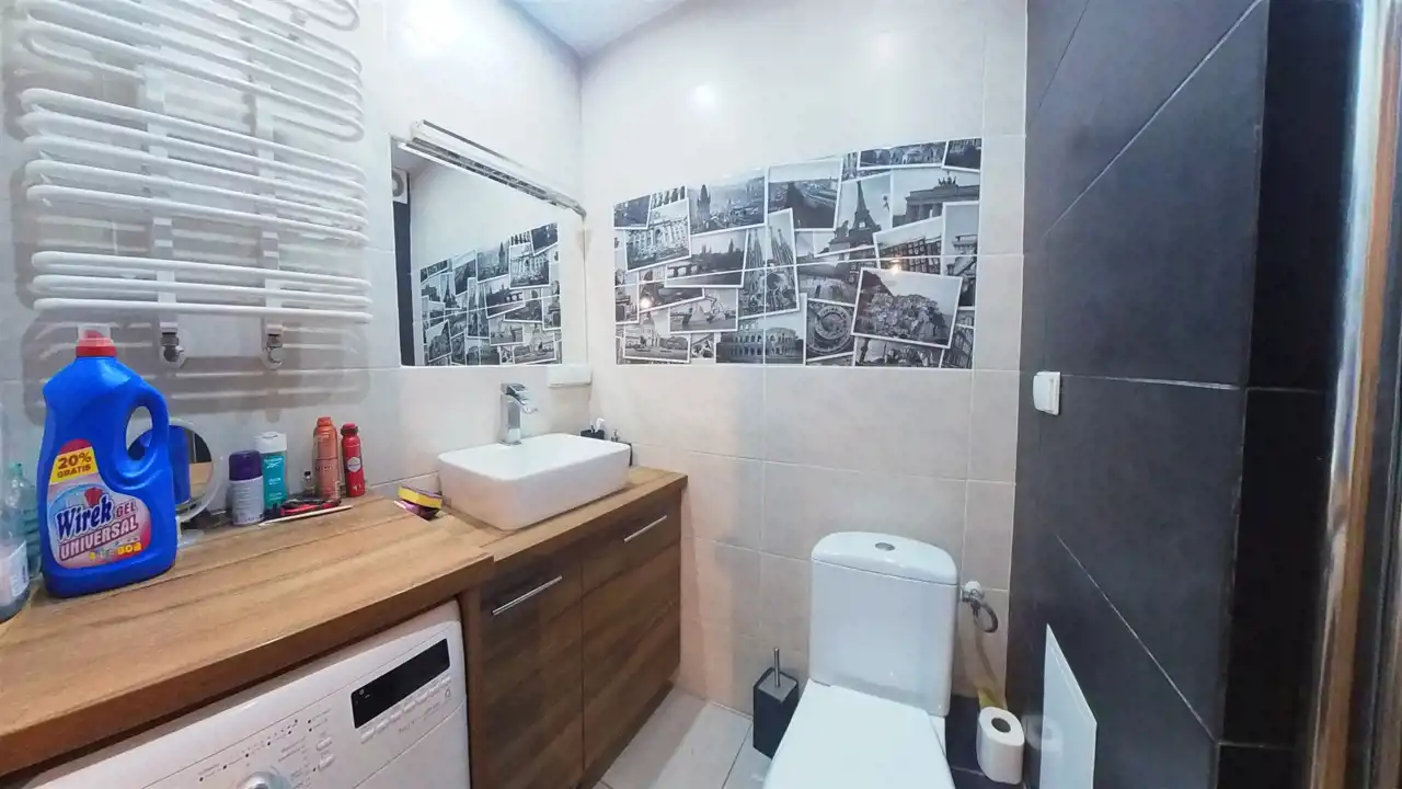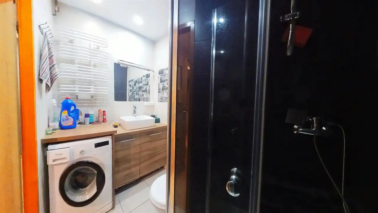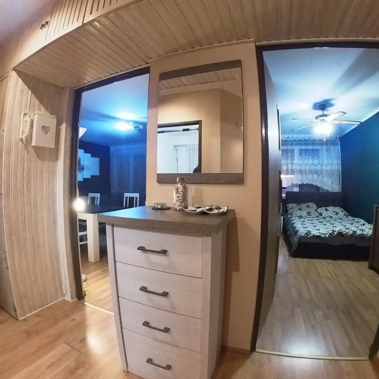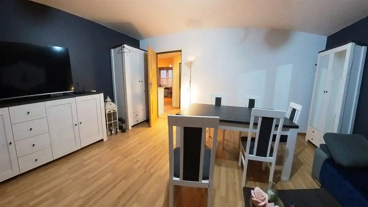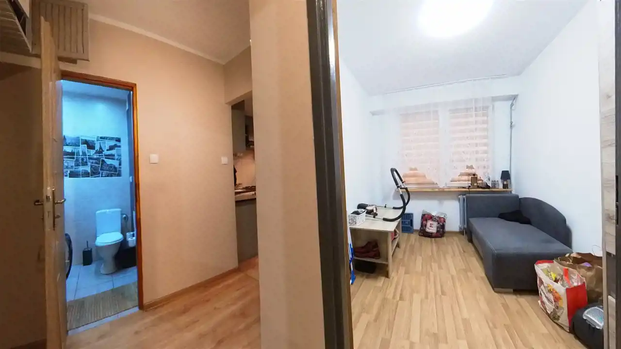 Mieszkanie składa się z małego pokoju, sypialni, dużego salonu z balkonem, przedpokoju i łazienki z kabiną prysznicową i WC.