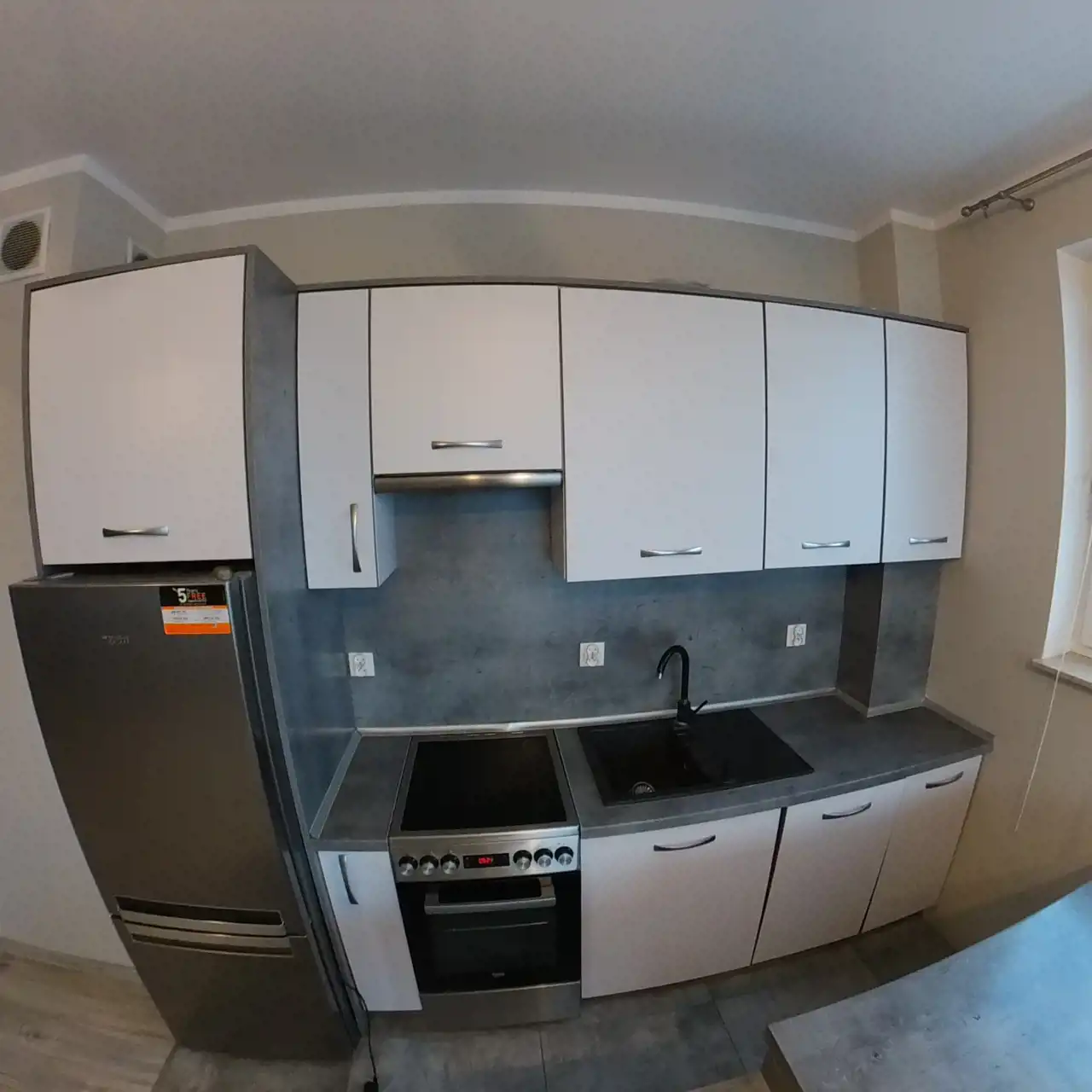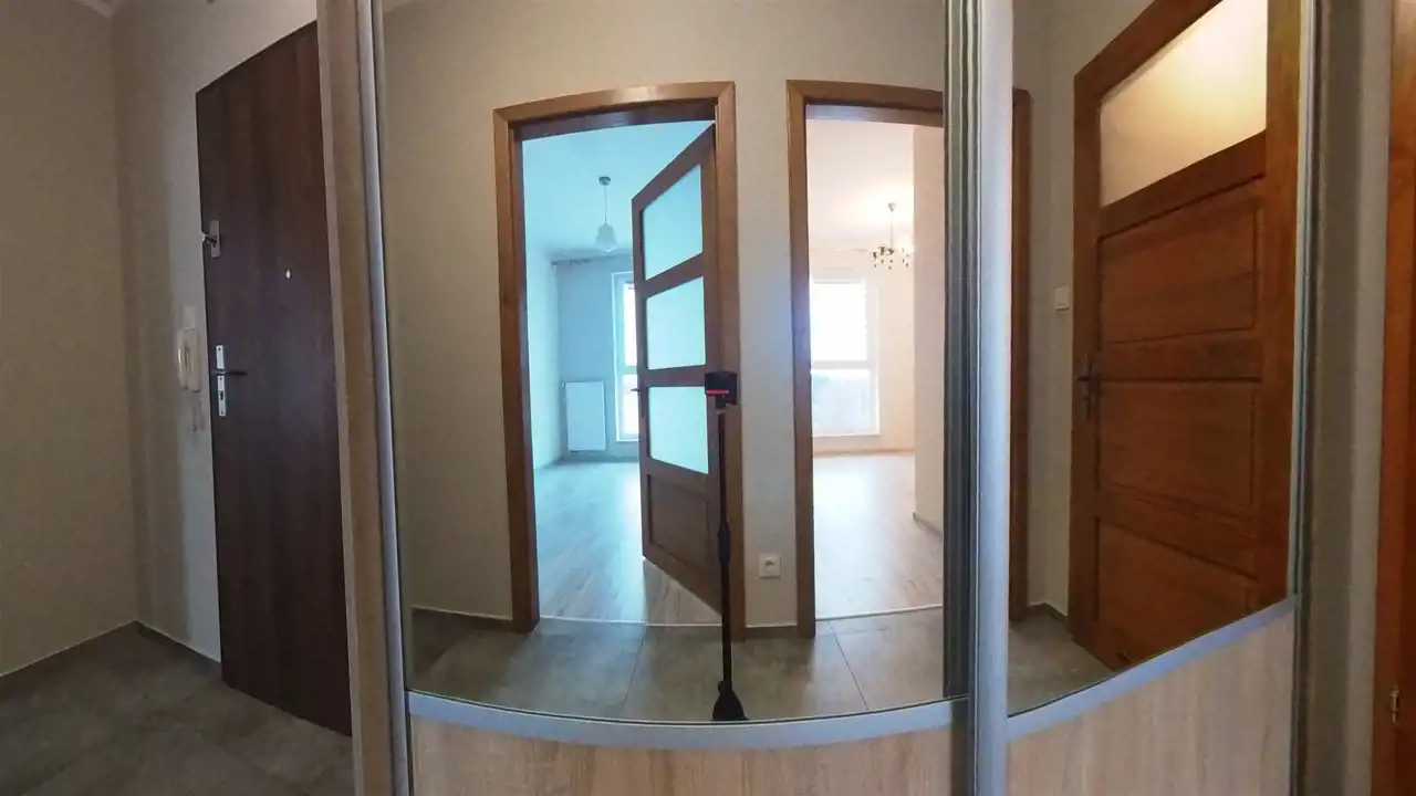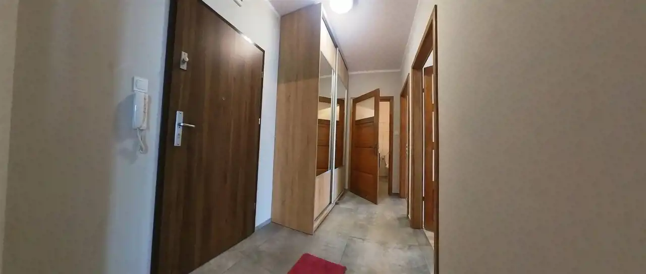 Mieszkanie składa się z dużego salonu z aneksem kuchennym, dwóch sypialni, łazienki oraz przedpokoju.