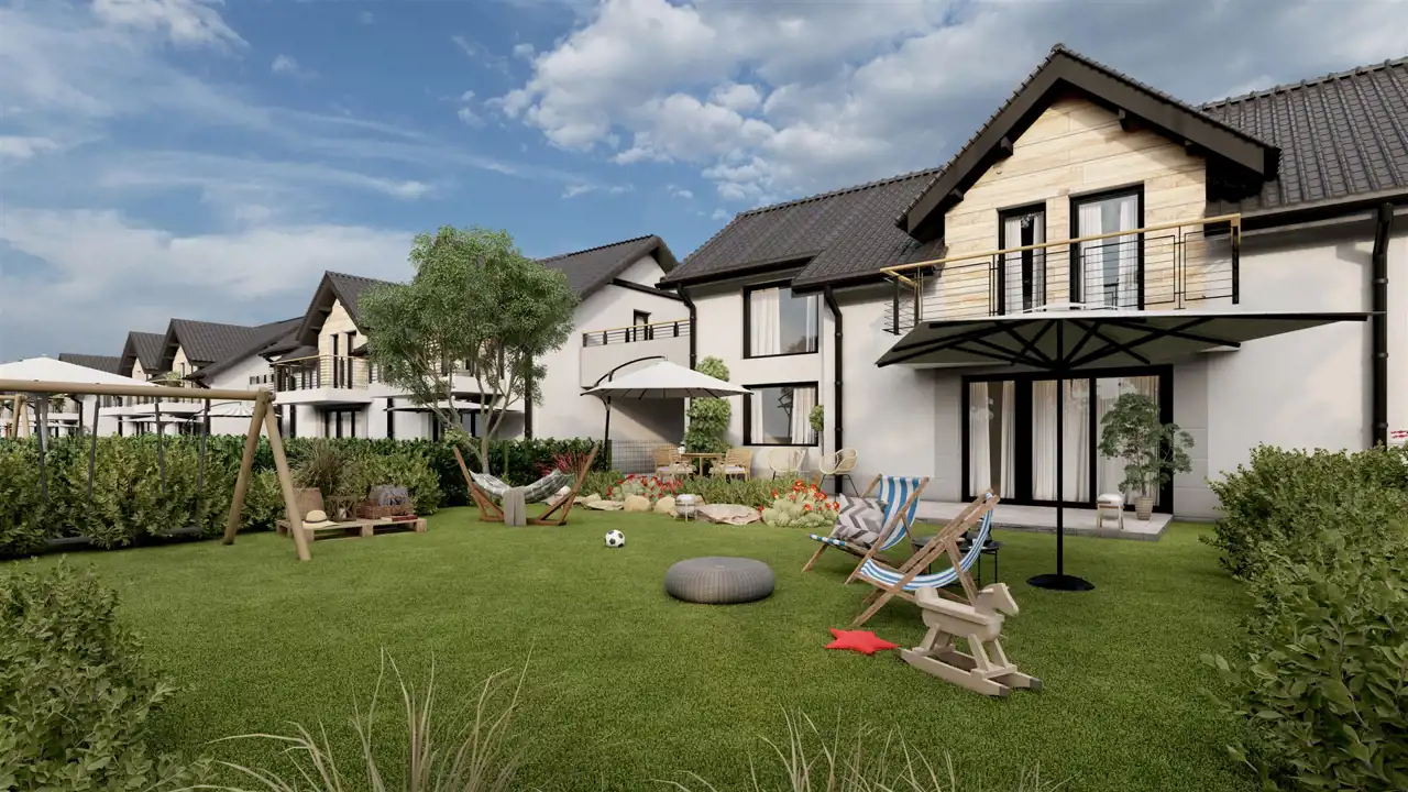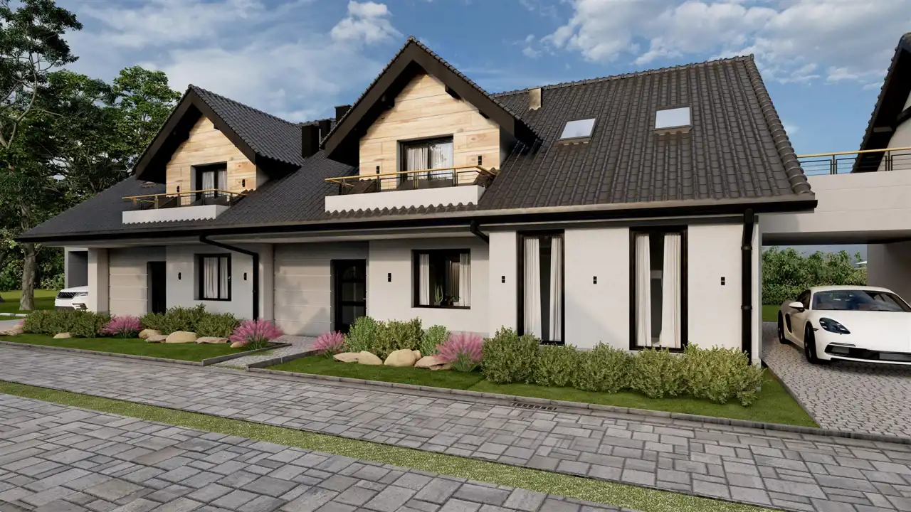 Przestronny dom dwu-rodzinny umiejscowiony w leśnej okolicy; Piętro składa się przestronnego salonu z aneksem kuchennym, trzech sypialni oraz łazienki; widok na las; ekspozycja północ-południe. Idealne miejsce dla rodziny poszukującej ciszej i spokojnej okolicy. Do piętra przynależą dwa balkony gwarantujące możliwość stworzenia własnego unikalnego klimatu. Na terenie osiedla domków przewidziany jest plac zabaw dla dzieci z różnymi atrakcjami. Na terenie osiedla są przewidziane liczne miejsca postojowe dla Gości oraz na dodatkowe samochody właścicieli.