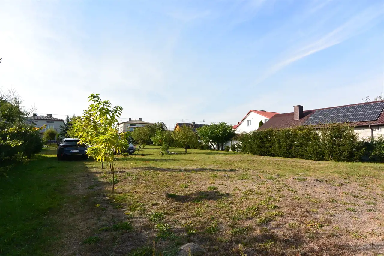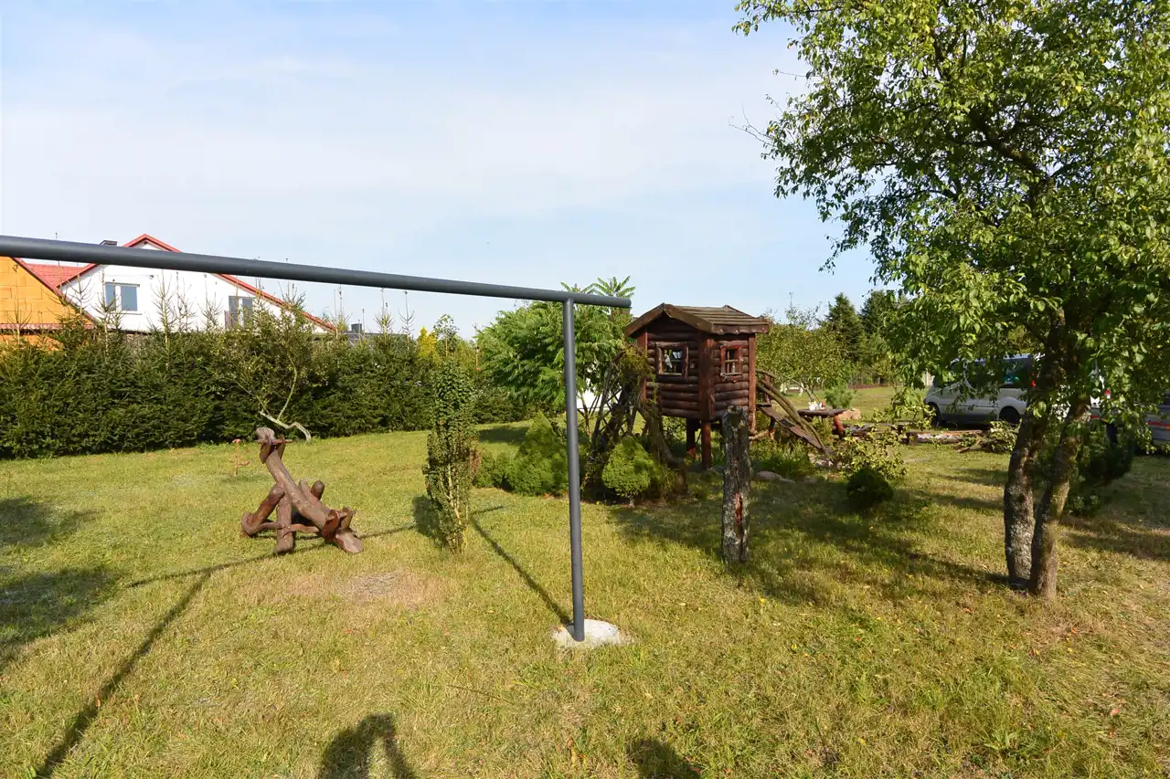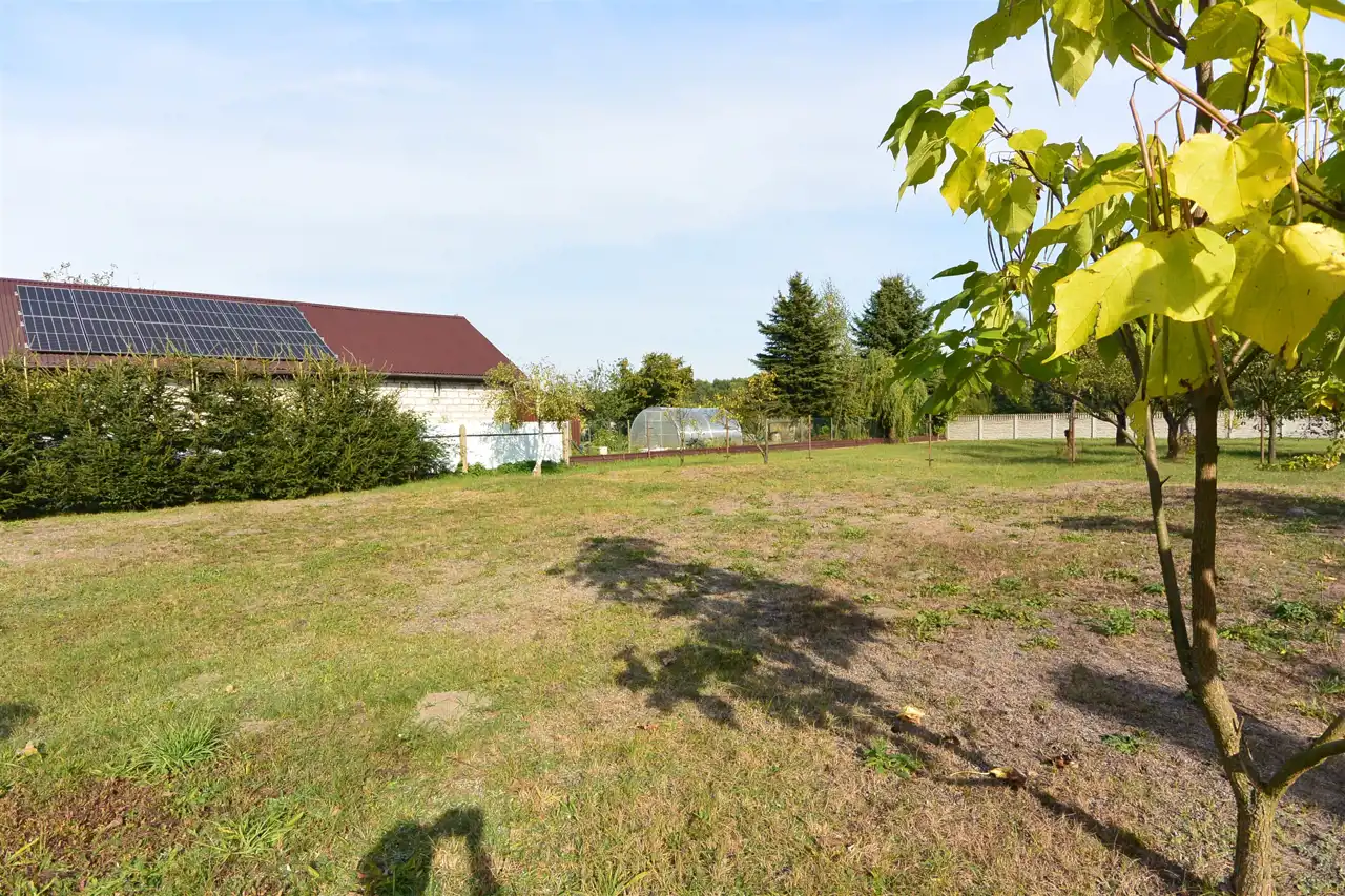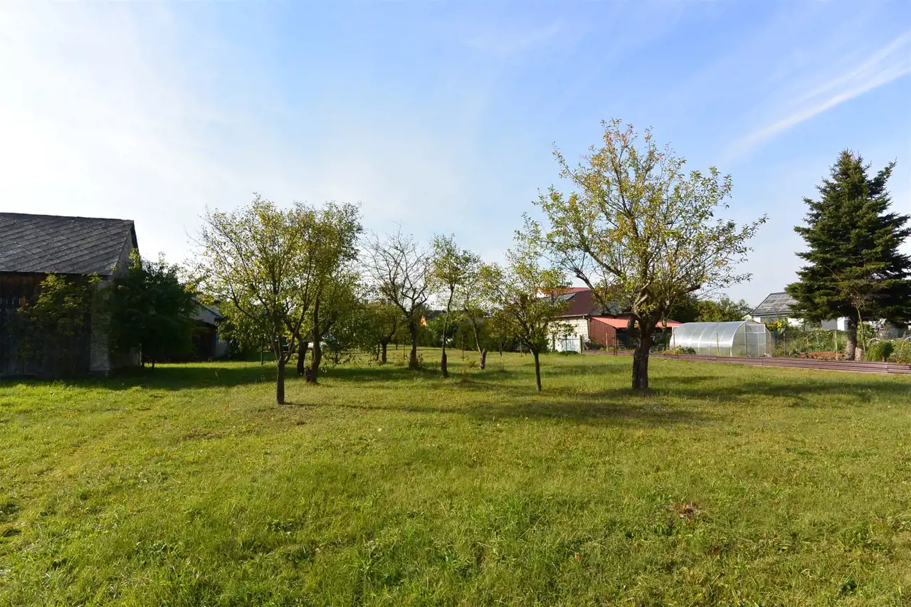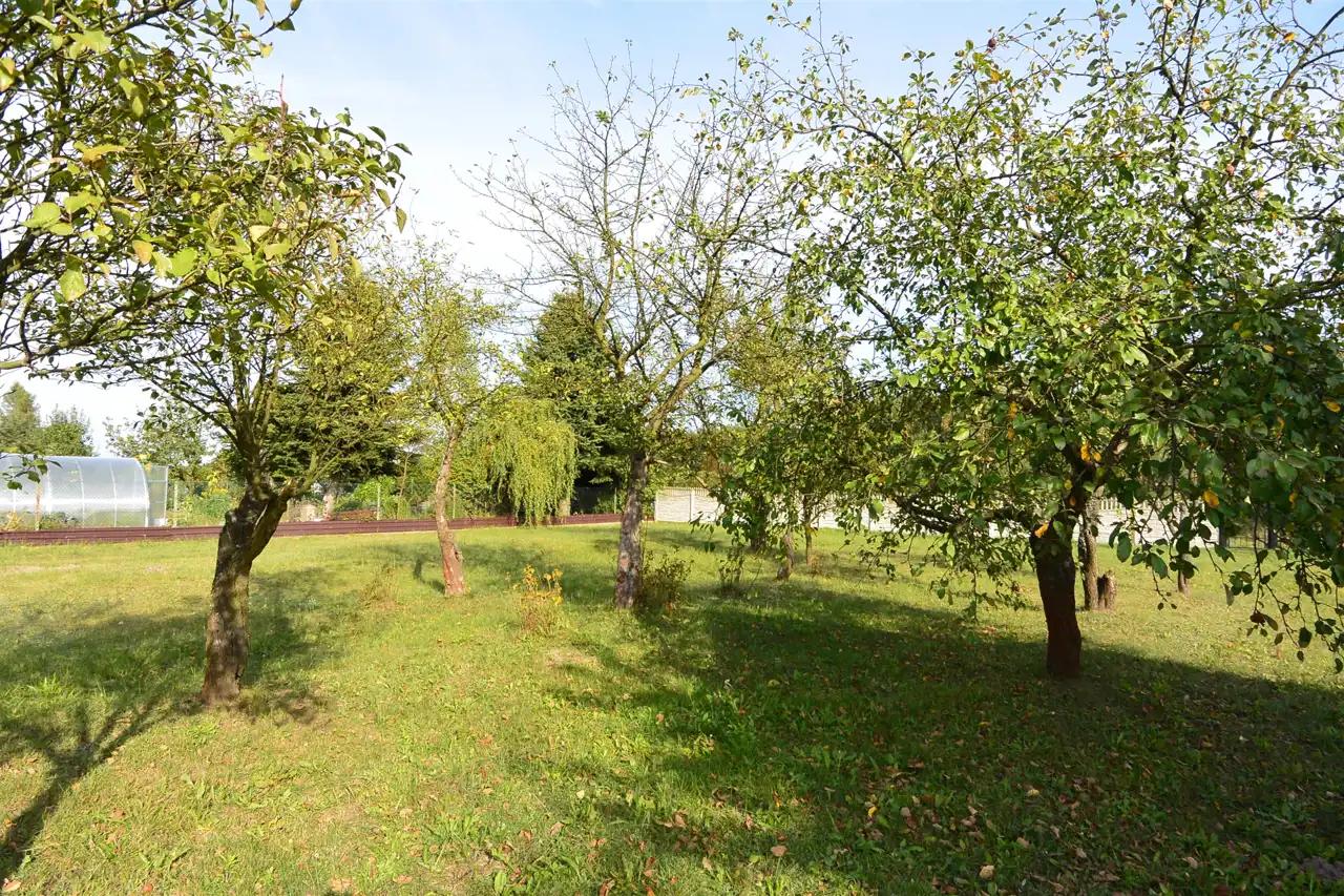Działka utrzymana w dobrym stanie, trawnik regularnie koszony, w tylnej części rosną wieloletnie drzewa owocowe.