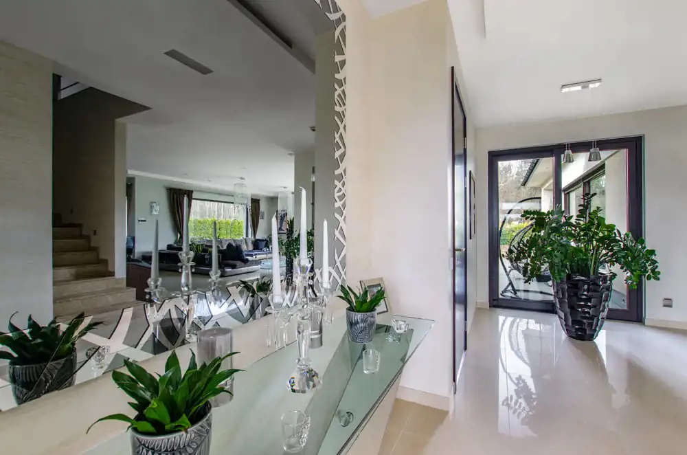 Do środka zapraszają szklane drzwi, jedne z wielu olbrzymich przeszkleń w domu, który wypełniony jest światłem. Tuż przy wejściu przemyślana garderoba, przez którą przemkniesz do dwustanowiskowego garażu.