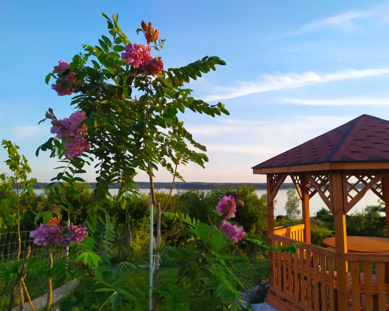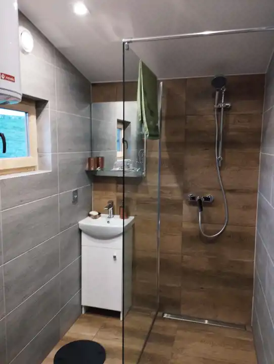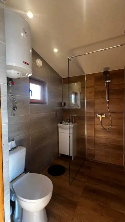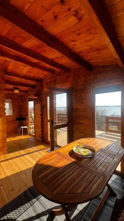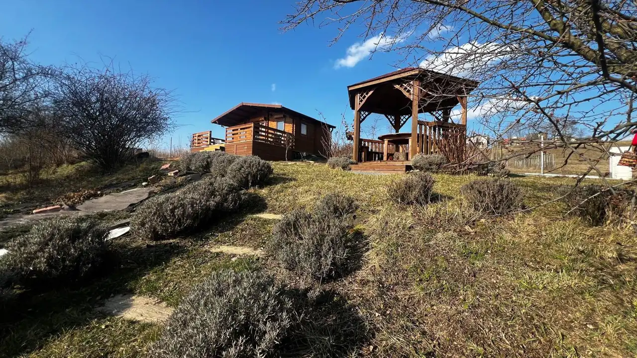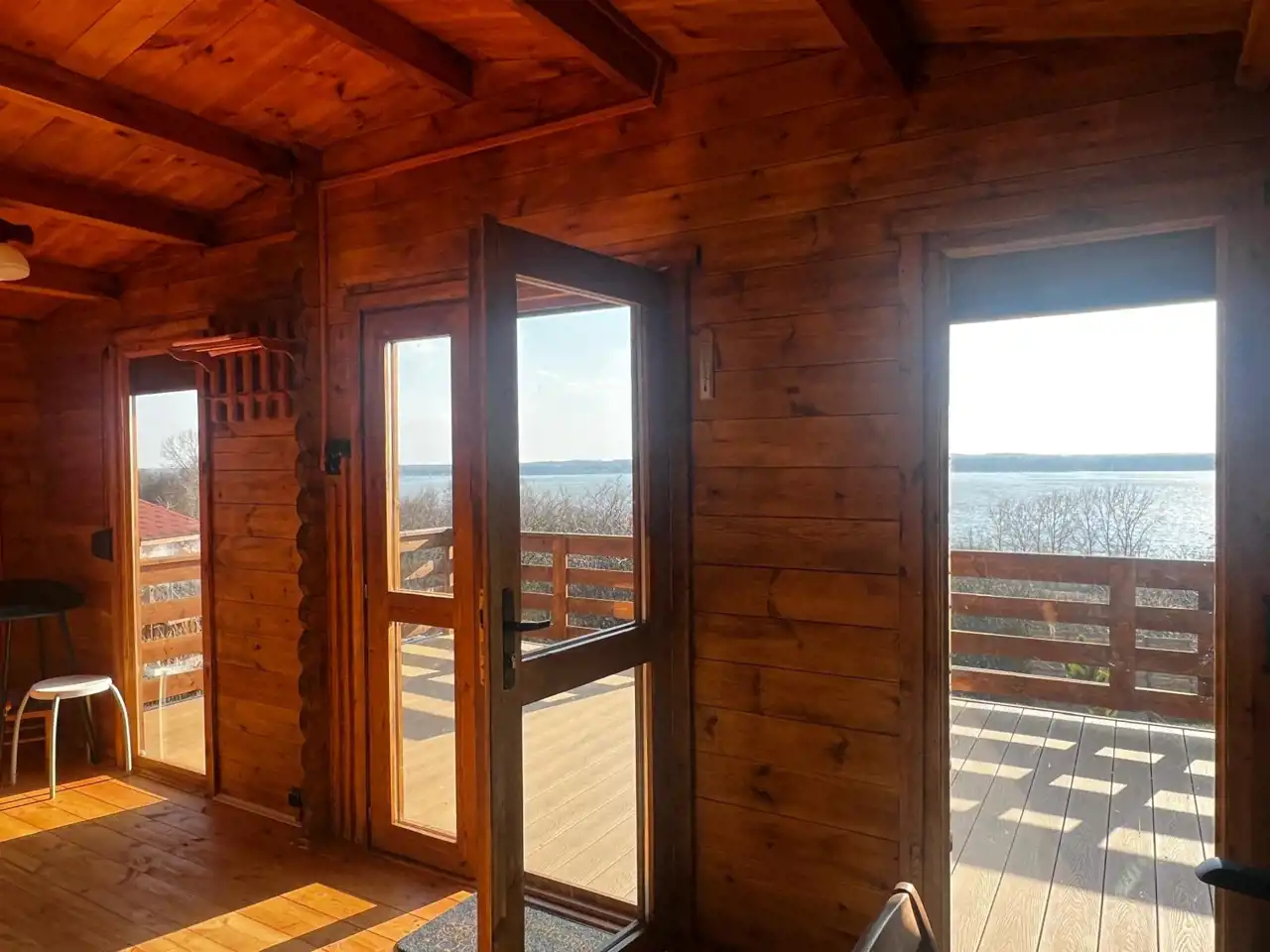 Na terenie działki znajduje się drewniany domek o powierzchni ok. 30 m² z przestronnym, 18-metrowym tarasem, który staje się naturalnym miejscem odpoczynku – idealnym na poranną kawę, letnie kolacje czy obserwowanie zachodzącego słońca. Domek jest w pełni urządzony i kompletnie wyposażony, gotowy do korzystania od pierwszego dnia.