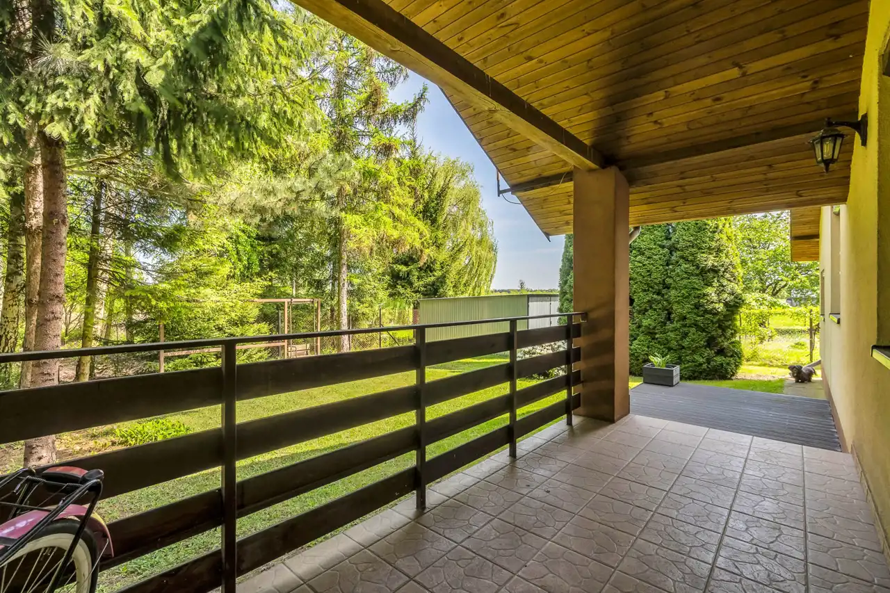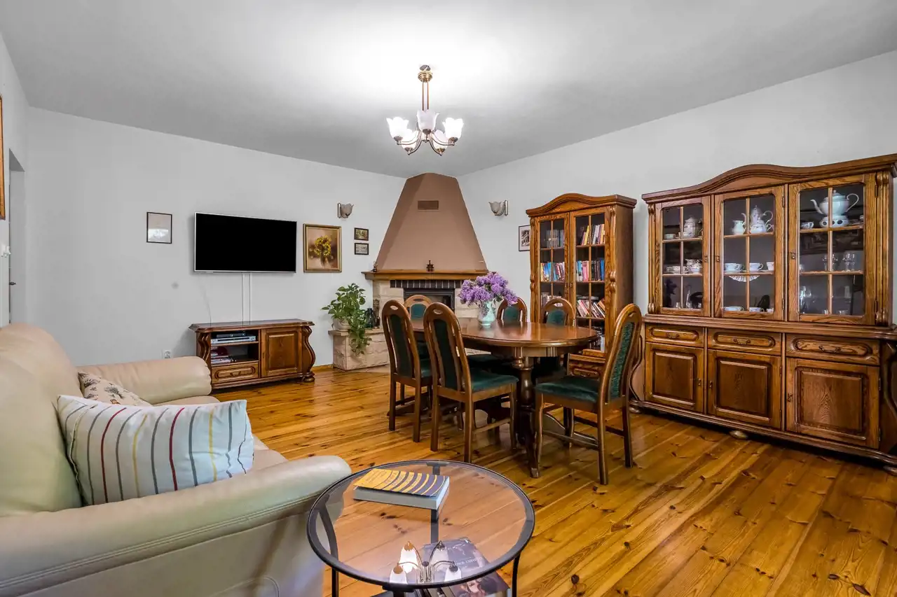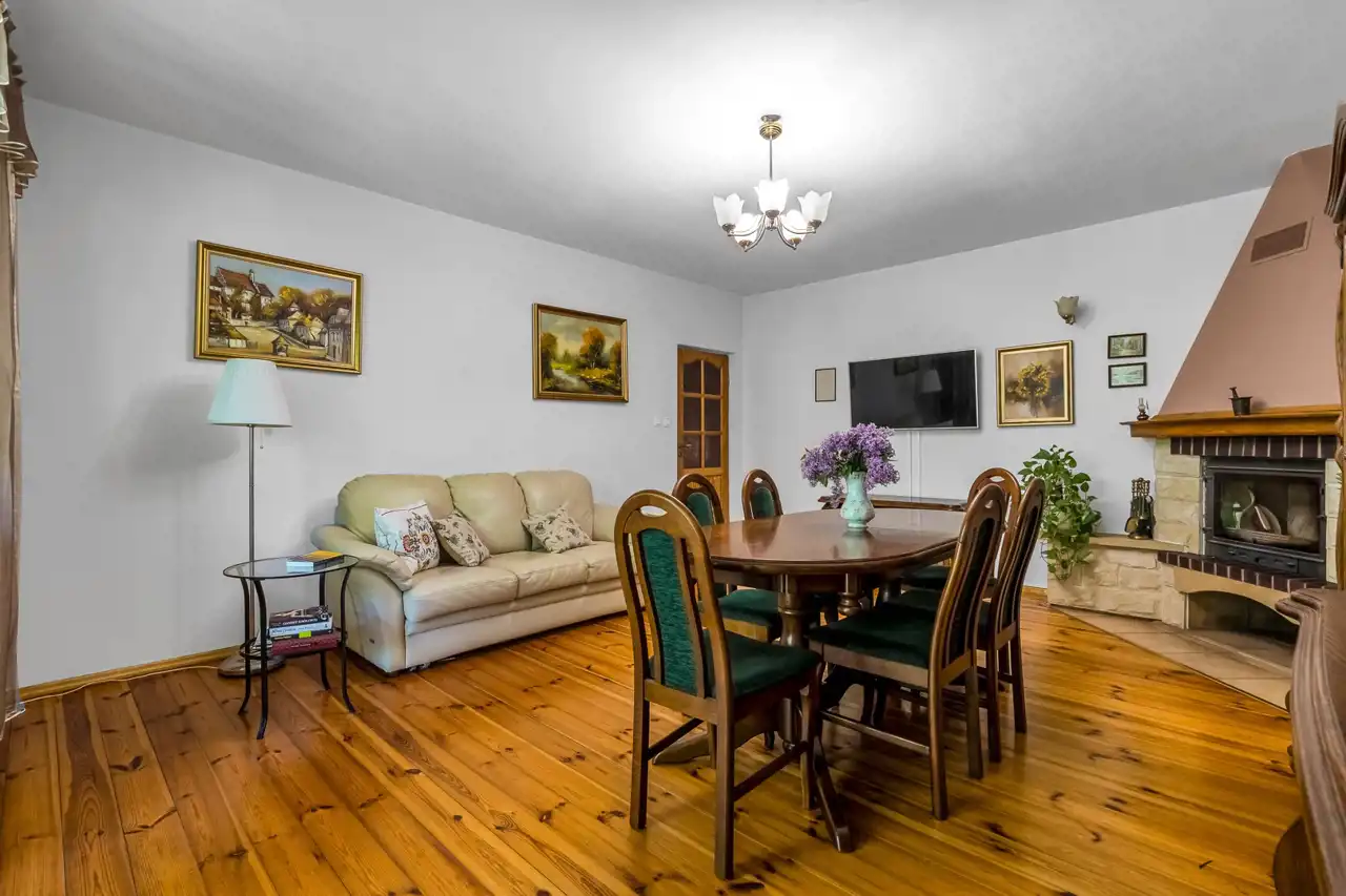 - salon kominkowy z tarasem i wyjściem na bardzo ładnie zagospodarowaną działkę,