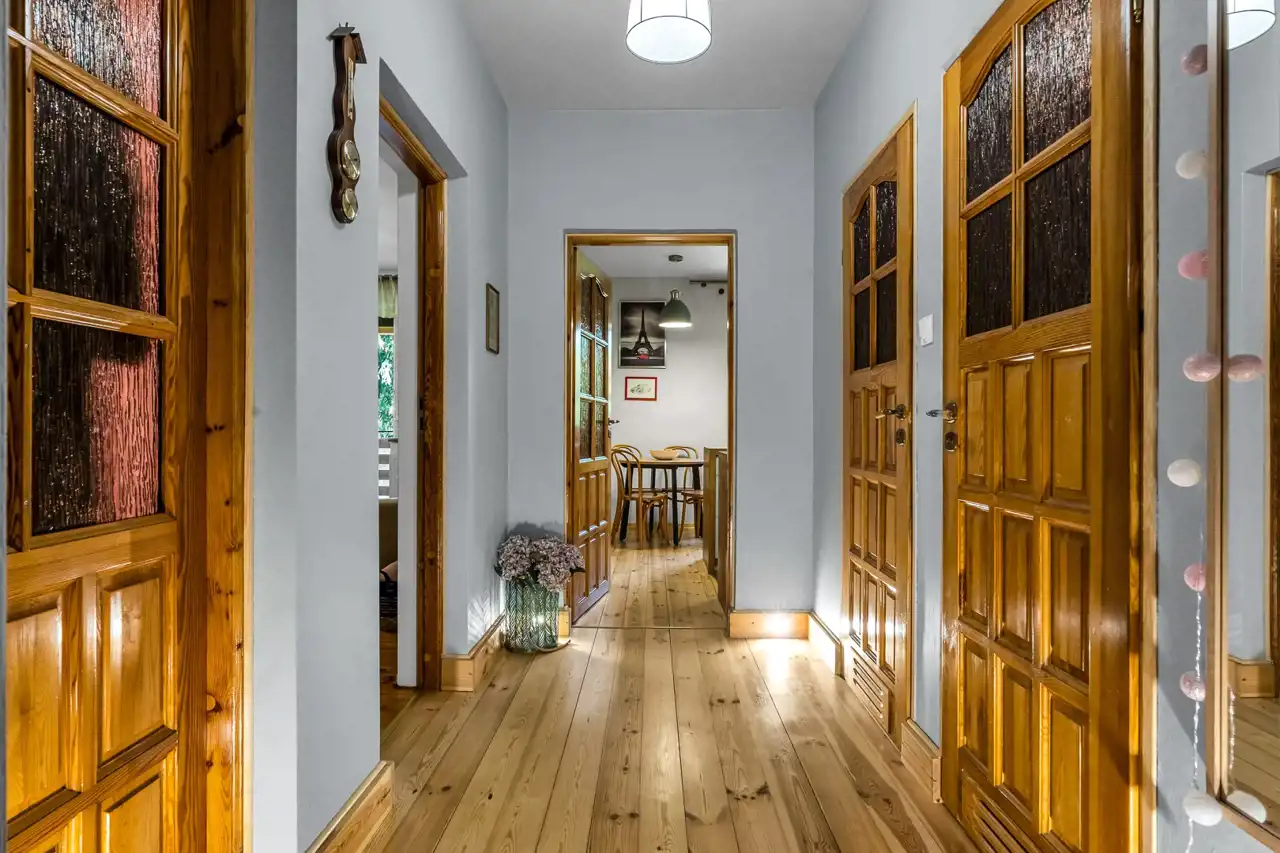 Dwustronny z jednej strony cicha uliczka z drugiej okna w stronę ogrodu. W sąsiedztwie zabudowa jednorodzinna. W całym domu drewniane podłogi. Dwa balkony oraz duży zagospodarowany zielenią ogród z tarasem.
