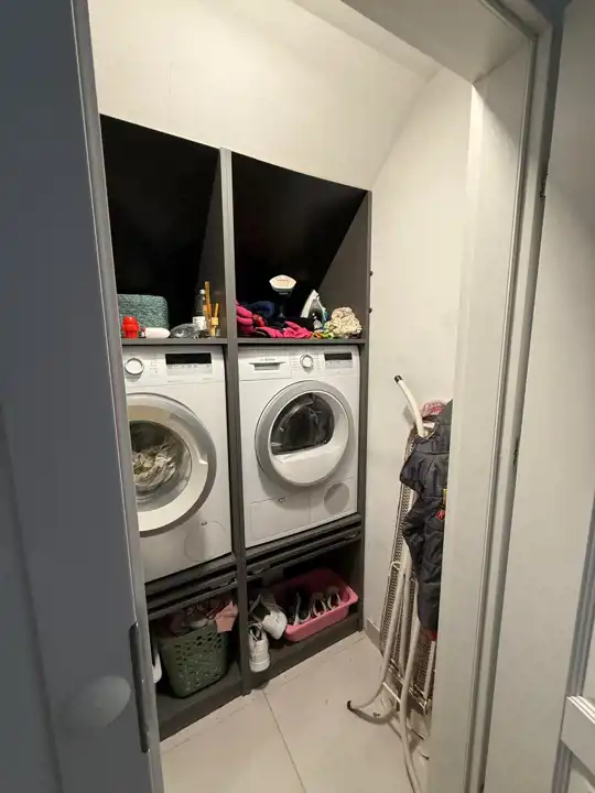 Na pierwszym piętrze znajdują się trzy pokoje, dwie łazienki oraz pralnia.