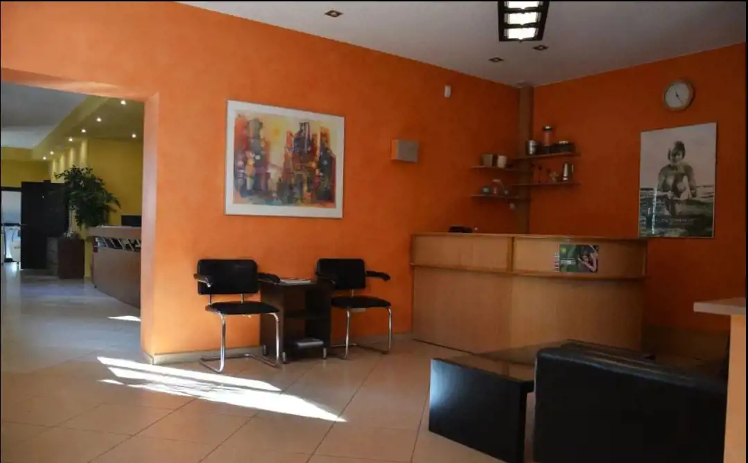 Budynek stoi na oddzielnej, ogrodzonej działce o pow. 2200m2, z oświetlonym parkingiem, wyłożonym kostką brukową. Zabudowania mają formę połączonych liter L z piętrem nad połową budynku.