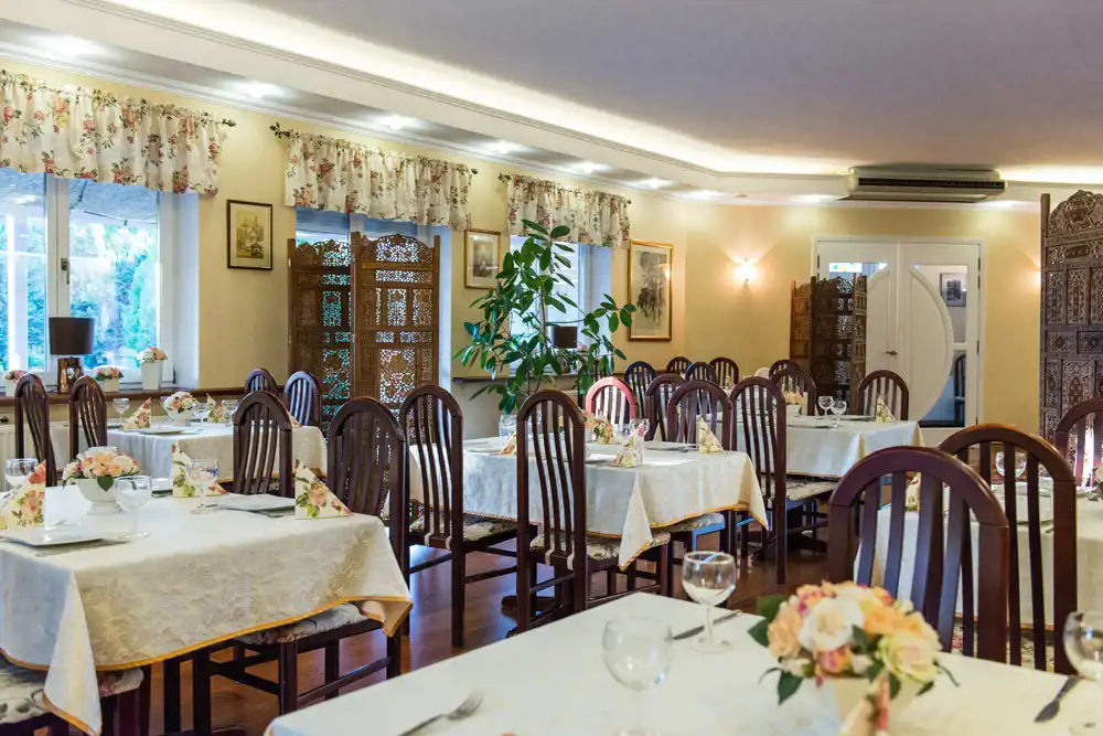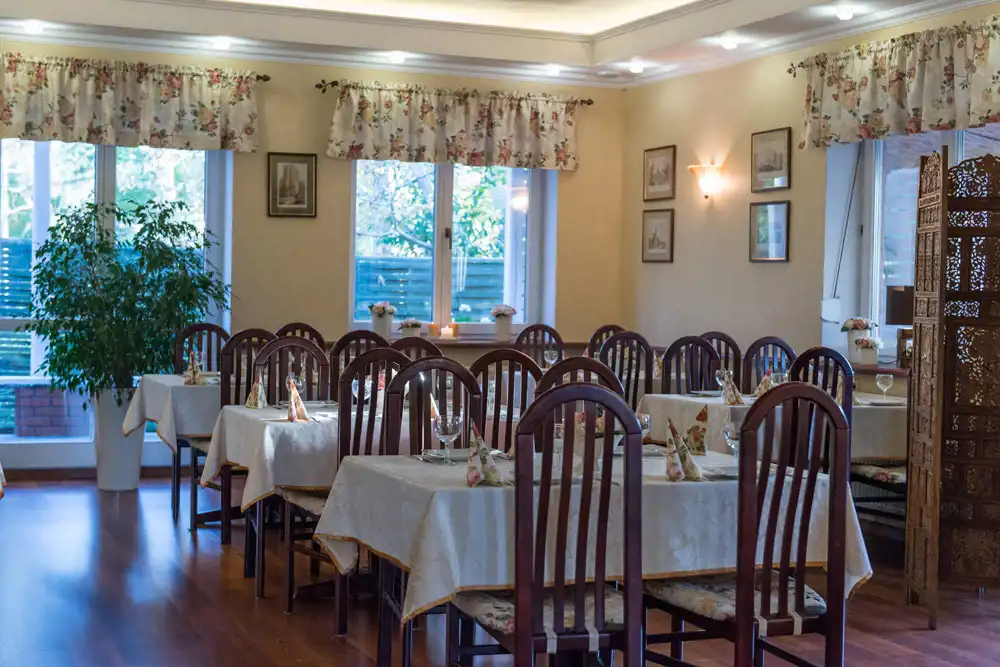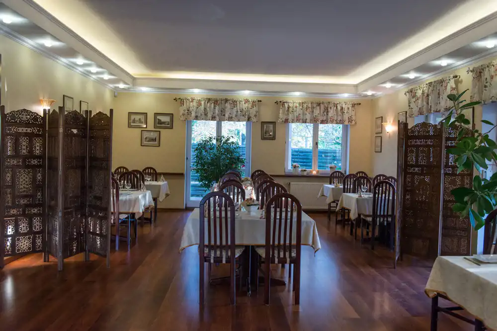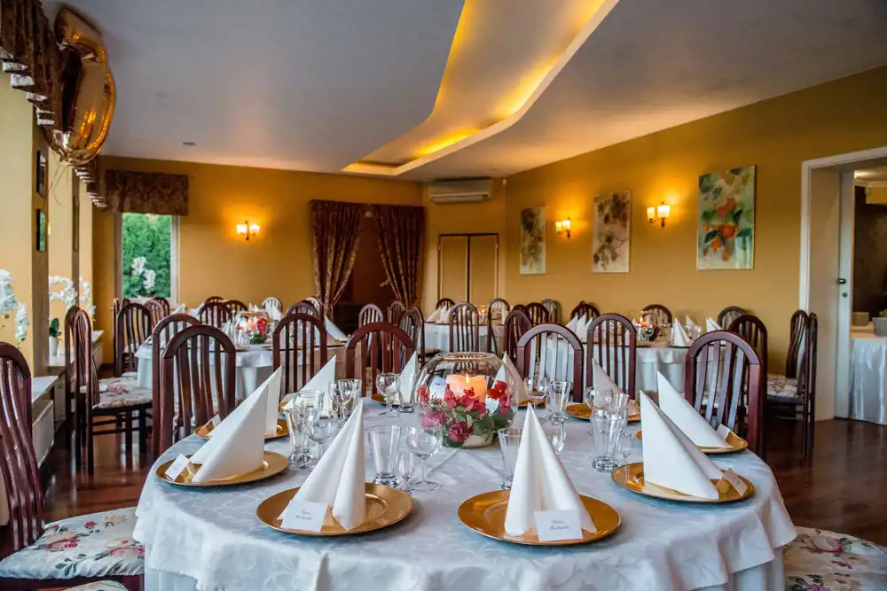 Na poziomie parteru znajdują się : 2 sale konsumpcyjno-konferencyjne ( na ok. 60 osób każda), bar, w pełni wyposażona, profesjonalna kuchnia, zmywalnia, pomieszczenia pomocnicze, magazynki, chłodnia,pomieszczenia socjalne, toalety dla klientów i pracowników, duży, zadaszony, klimatyzowany taras oraz klatka schodowa łącząca parter z poddaszem.