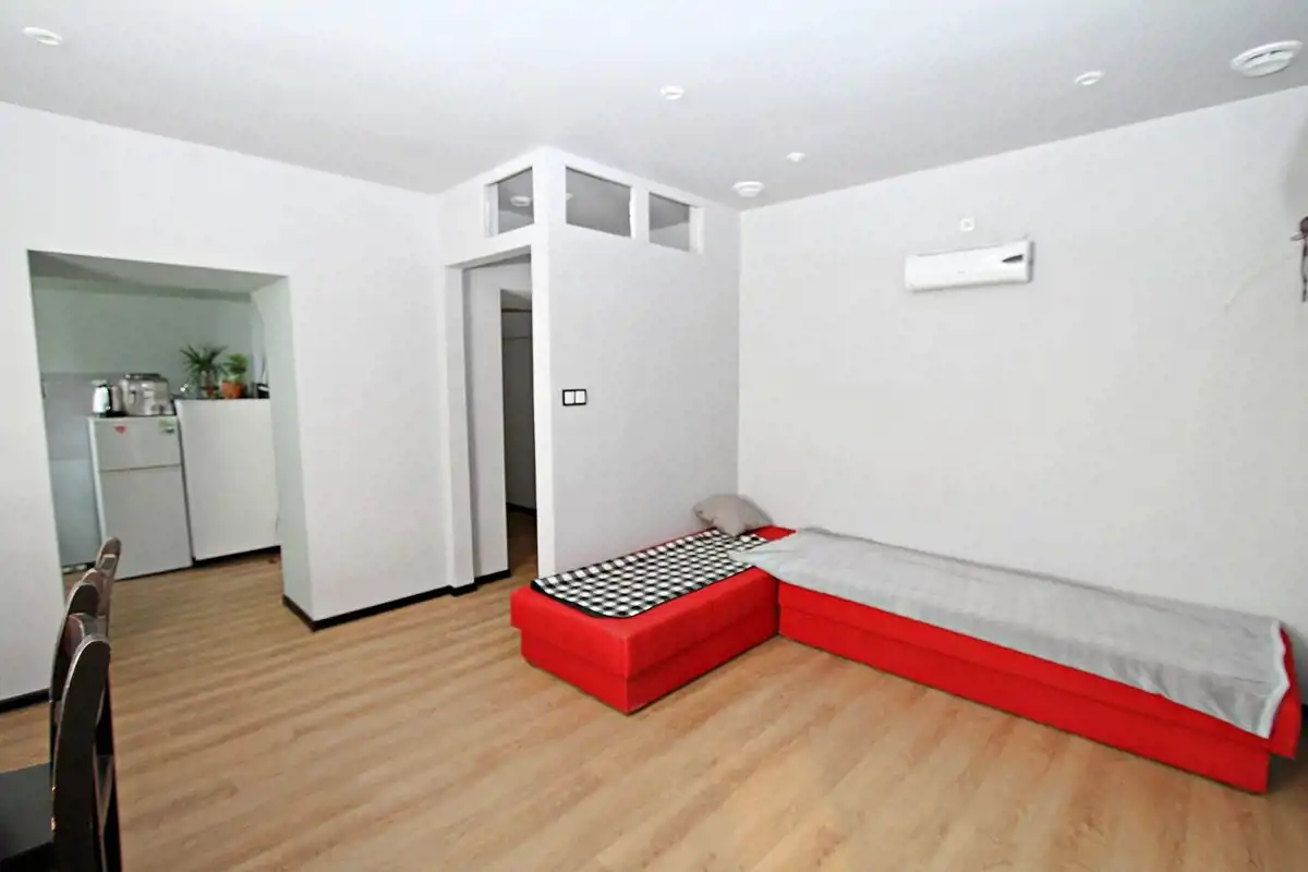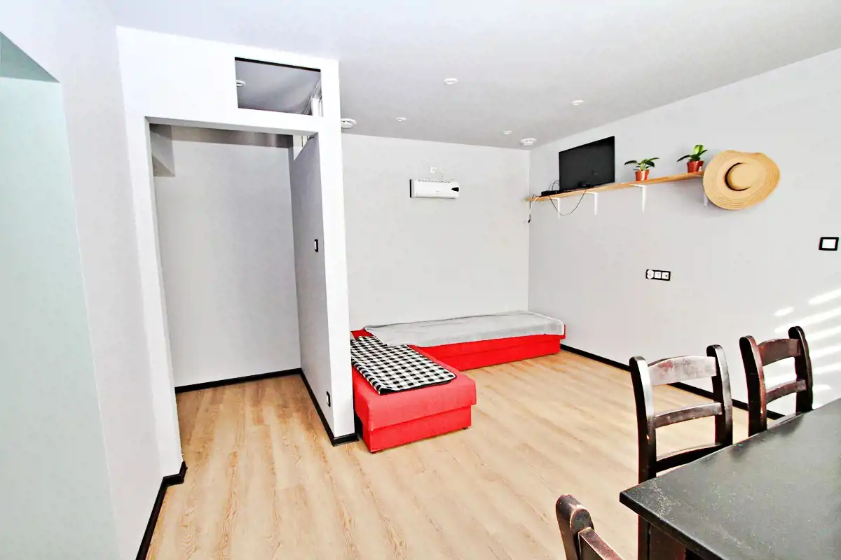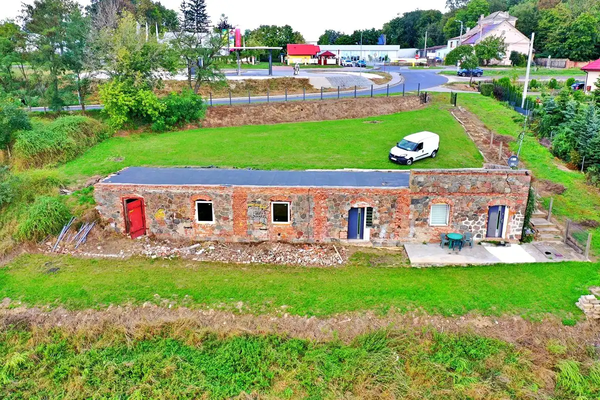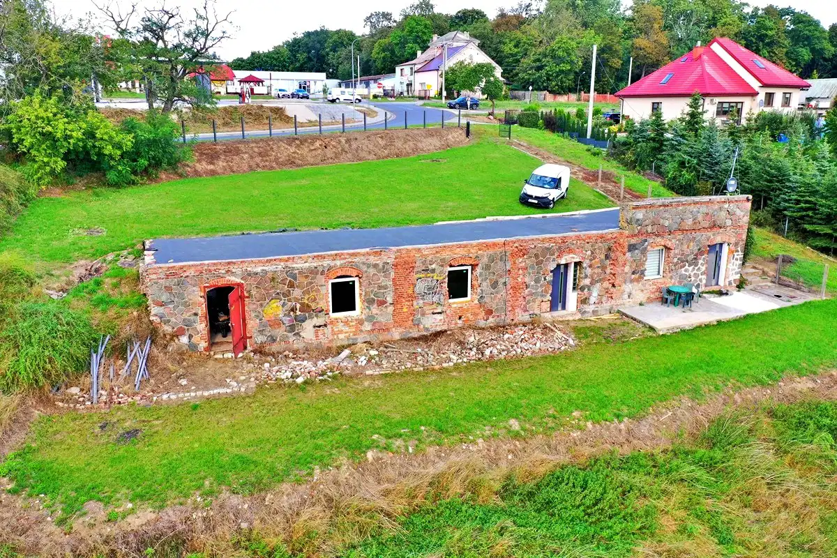 część wyremontowana (ok. 35 m²) – gotowa do zamieszkania, obejmuje dwa pokoje (jeden z aneksem kuchennym) oraz łazienkę z WC,