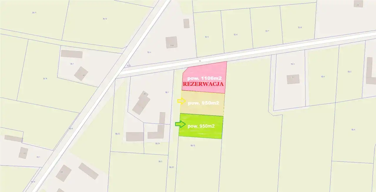 Przed podziałem, w 2023r. dla działki (pow. 3000m2) zostały wydana decyzja o warunkach zabudowy dla budowy 3 domów jednorodzinnych. Na podstawie decyzji WZ działka została podzielona na 3 (1106m2, 950m2 i 950m2).