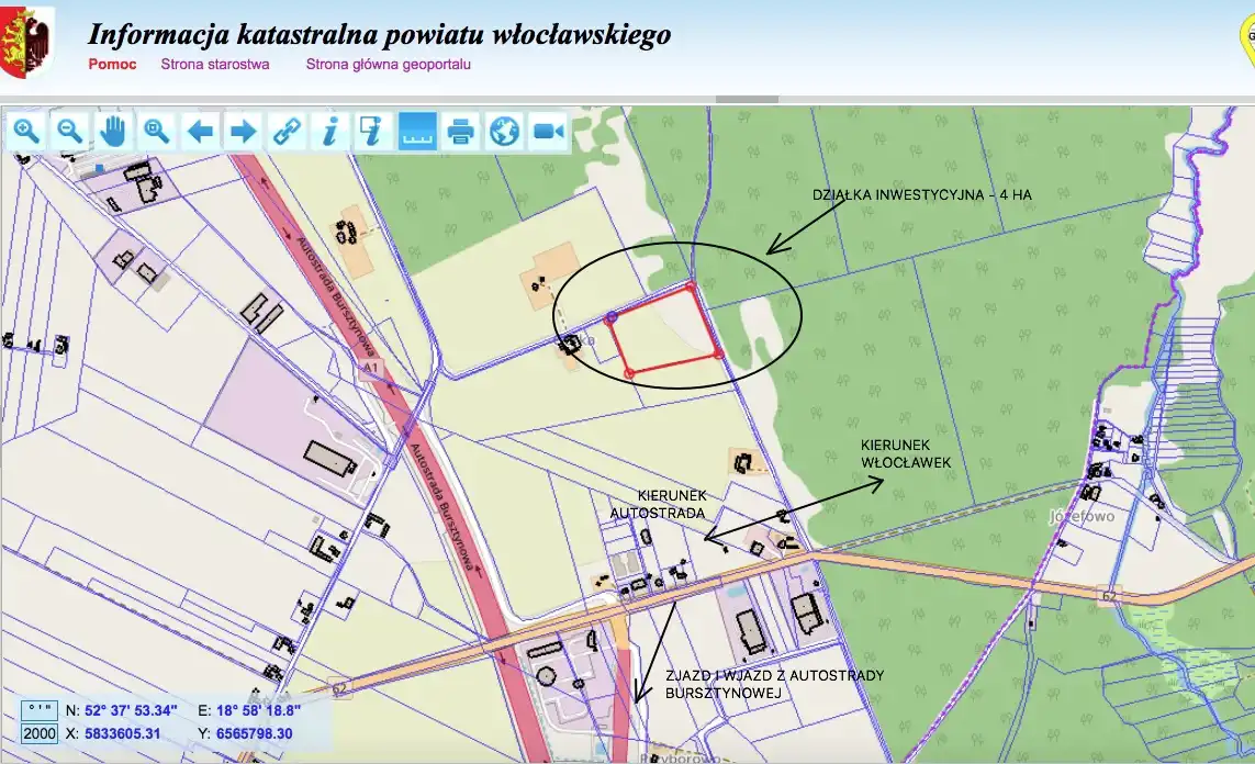 Działka w idealnej lokalizacji przy zjeździe do autostrady oraz asfaltowej drodze łączącej miasto Włocławek- autostradę i Brzeską Strefę Gospodarczą .