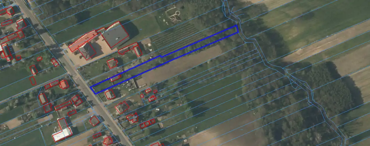 - Działka częściowo zagospodarowana, lekko nachylona, prostokąt