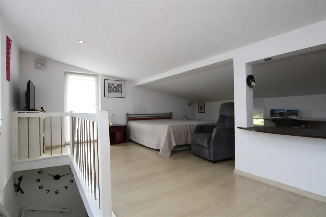 Poddasze to przestronny pokój, garderoba oraz łazienka.