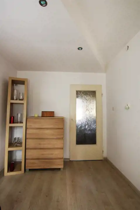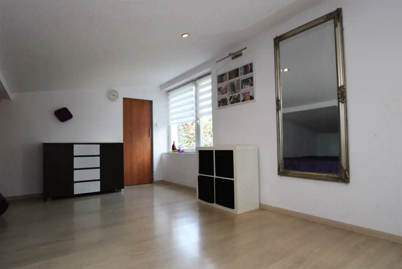 Na podłogach panele i gres w łazience, ściany w gładzi gipsowej pomalowane.