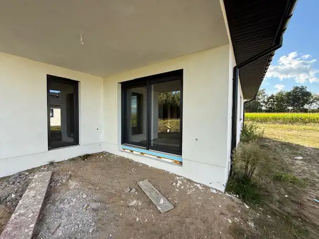 - materiały użyte do budowy- ściany z ceramiki kozłowickiej, ocieplenie styropian grafitowy 15 cm, dach pokryty blachodachówką Futura, stolarka okienna trzyszybowa Kris-Pol, rolety zewnętrzne, drzwi zewnętrzne KMT,