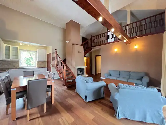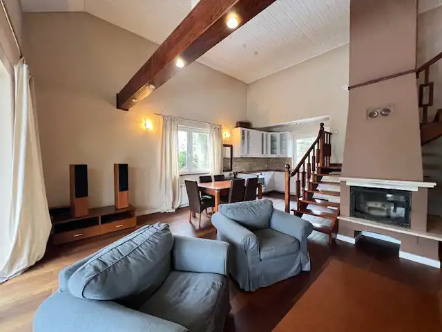 Salon z kominkiem - robi niesamowite wrażenie nie tylko z uwagi na swoją wielkość, ale przede wszystkim wysokość sklepienia - 4,2 metra wysokości - na podłodze drewno egzotyczne - merbau.