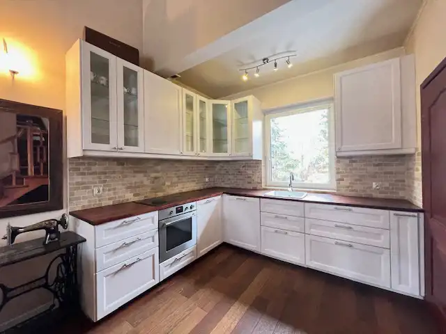 Kuchnia - przepiękna, otwarta, widna z jadalnią i otwartym (48 m2) salonem - na podłodze drewno egzotyczne - merbau. Kuchnia doskonale zaplanowana i zabudowana. Sprzęt Agd w cenie. Przy kuchni znajduje się spiżarnia - 2m2.