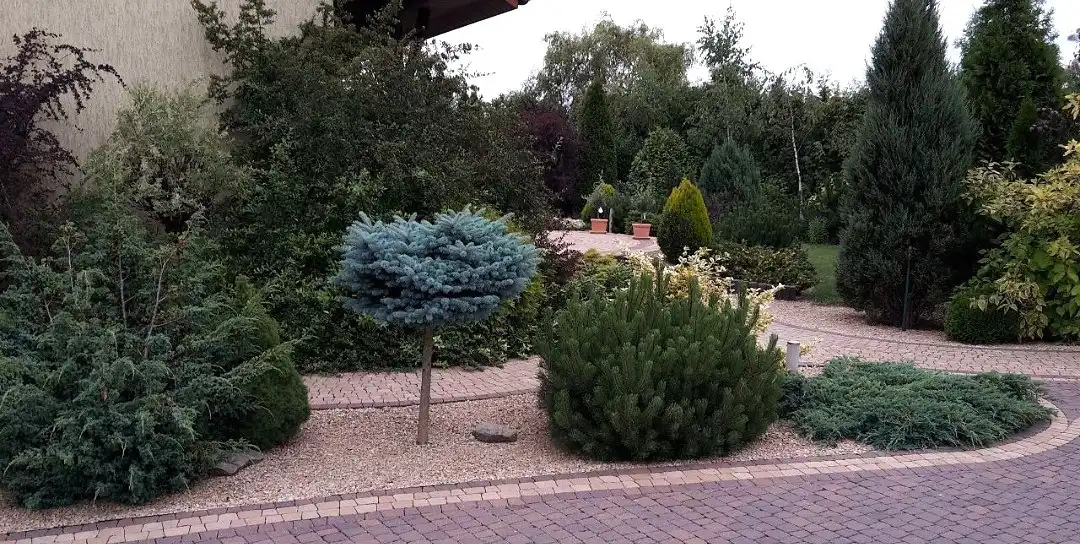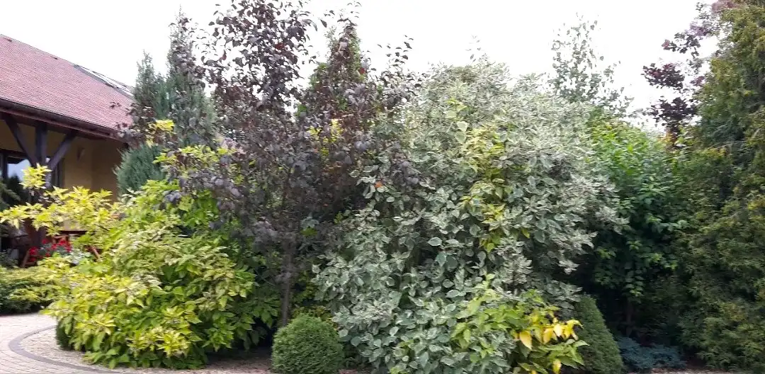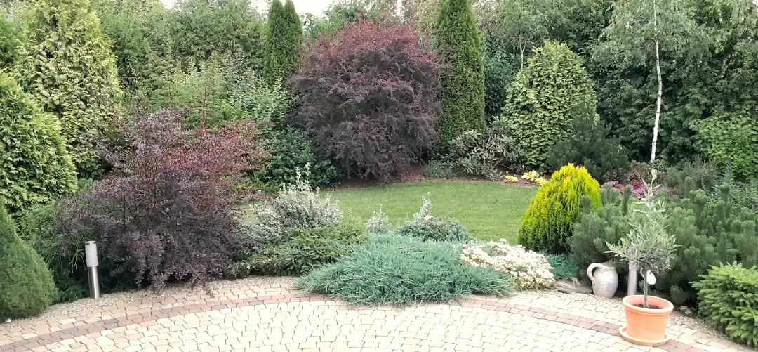 Teren został fachowo i pięknie obsadzony drzewkami i krzewami o różnej wielkości , strukturze i niespotykanych kolorach .