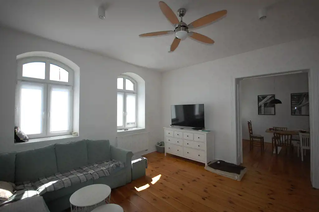 - Salon o pow.ok 18,10 m2 - na podłogach lite drewno-deski, ściany gipsowane oraz płyty karton-gips, szerokie drewniane drzwi z przejściem do dużego pokoju, okna pcv (zachowujące kształtem charakter budynku) salon w pełni otwarty na przestronną kuchnię;