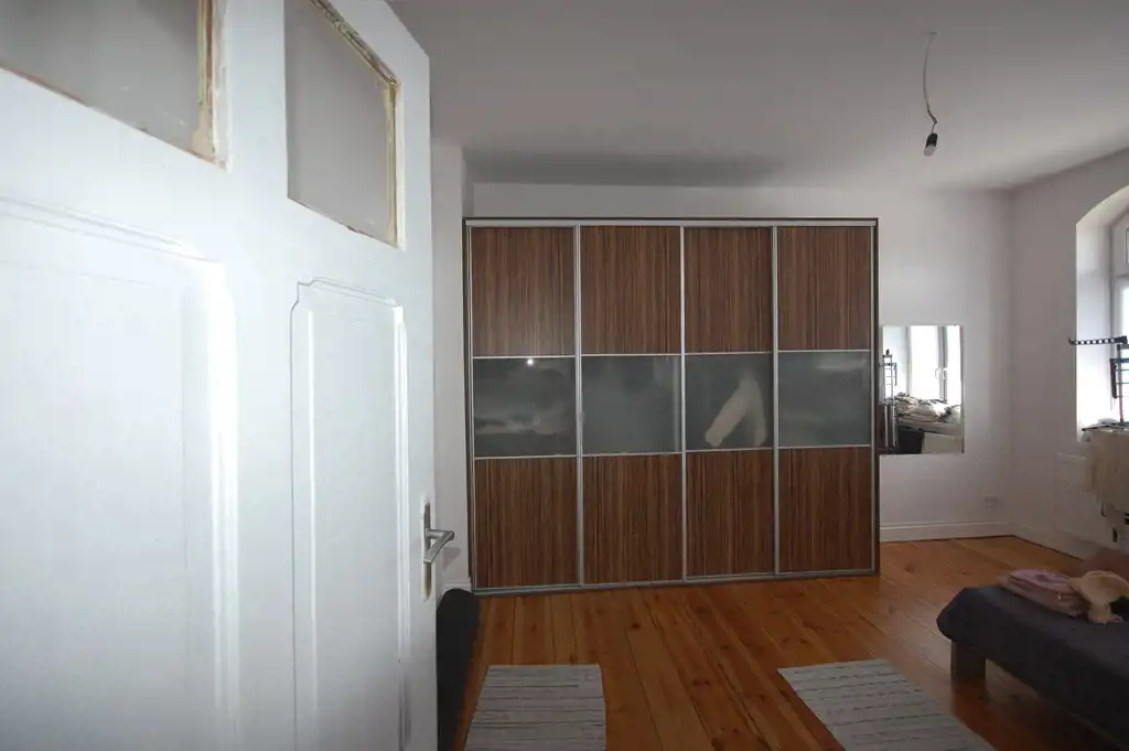 - Sypialnia o pow.ok 18,80 m2 - podłoga deski, ściany gipsowane-malowane, szafa w zabudowie (duża o głębokości 60 cm)