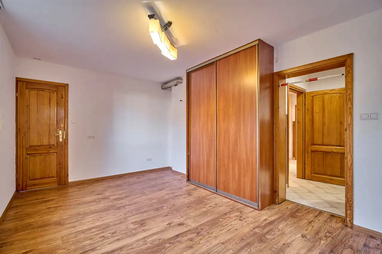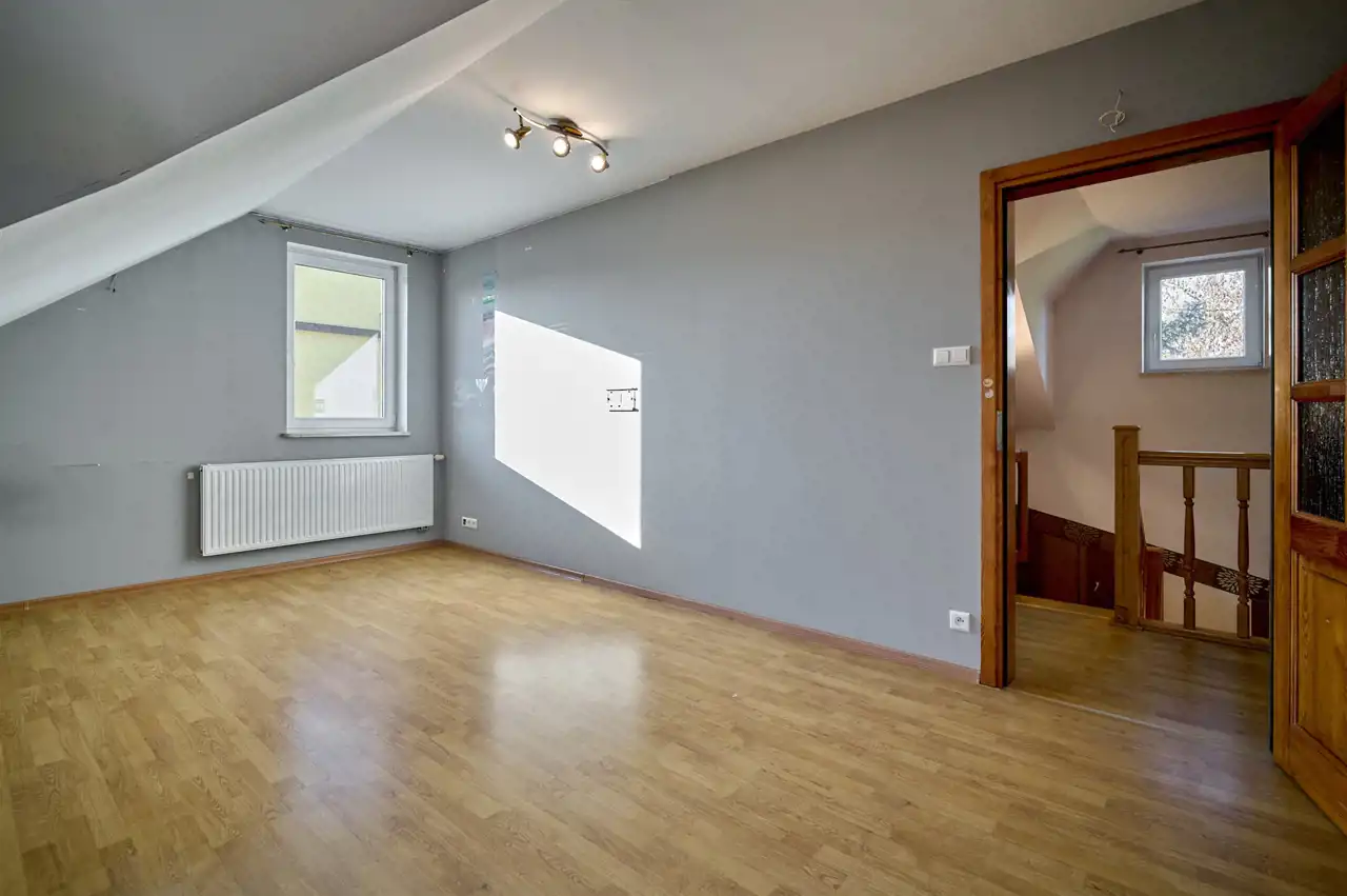 Garaż w bryle budynku, obecnie zaadaptowany na dodatkowy pokój, świetnie sprawdzi się również jako gabinet, studio lub pomieszczenie pod niewielką działalność.