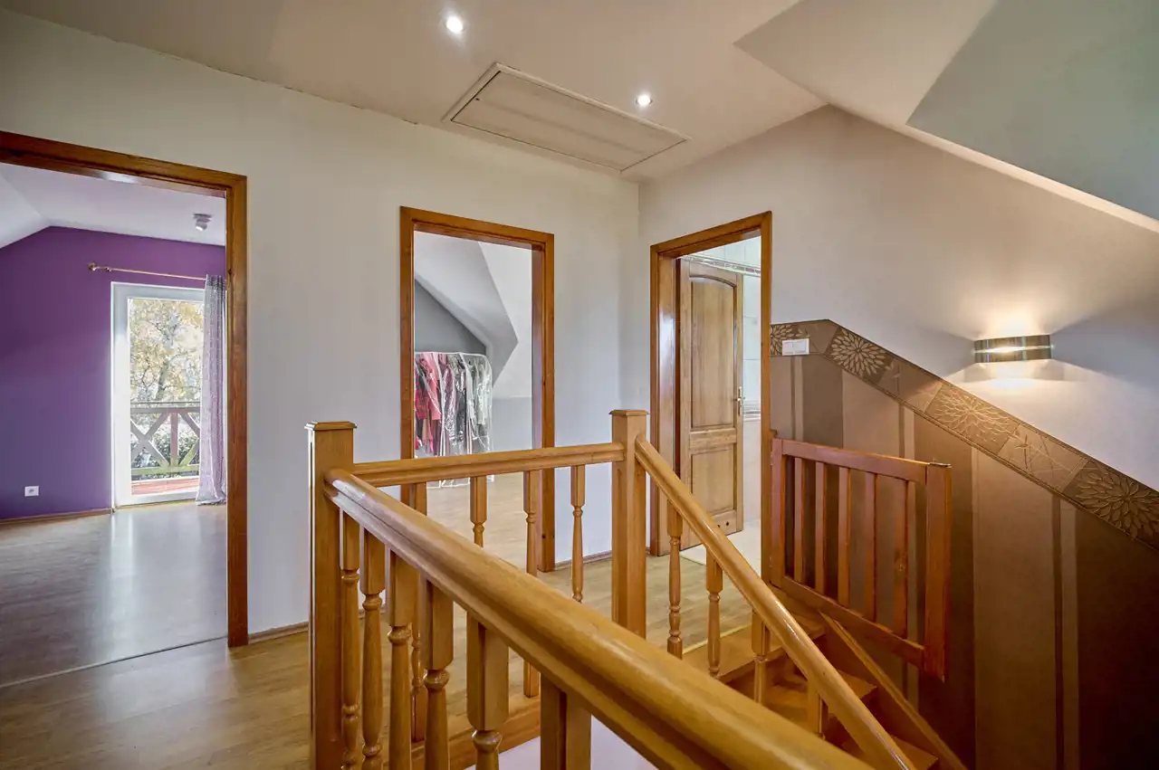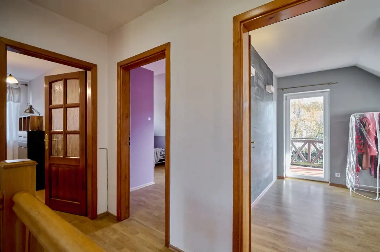 Dom oferuje przemyślany, niezwykle czytelny podział na strefy: część dzienna na parterze z przestronnym salonem oraz praktyczną kuchnią, a także strefa prywatna na poddaszu — trzy komfortowe sypialnie oraz duża łazienka tworzą idealne miejsce wypoczynku.